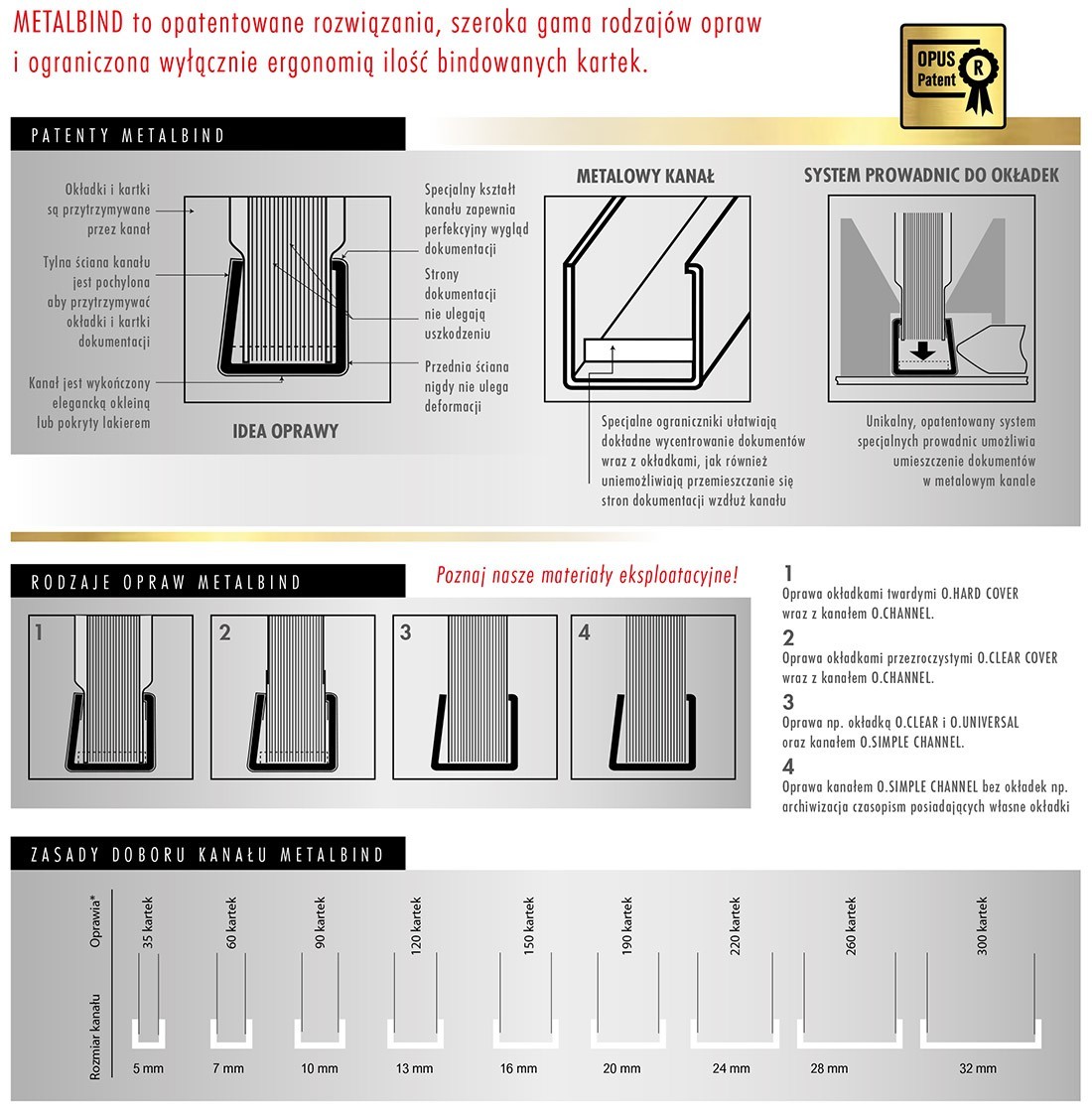 Metalowe, oklejane kanały systemu METALBIND, które w połączeniu z okładkami miękkimi lub twardymi stanowią elegancką oprawę.