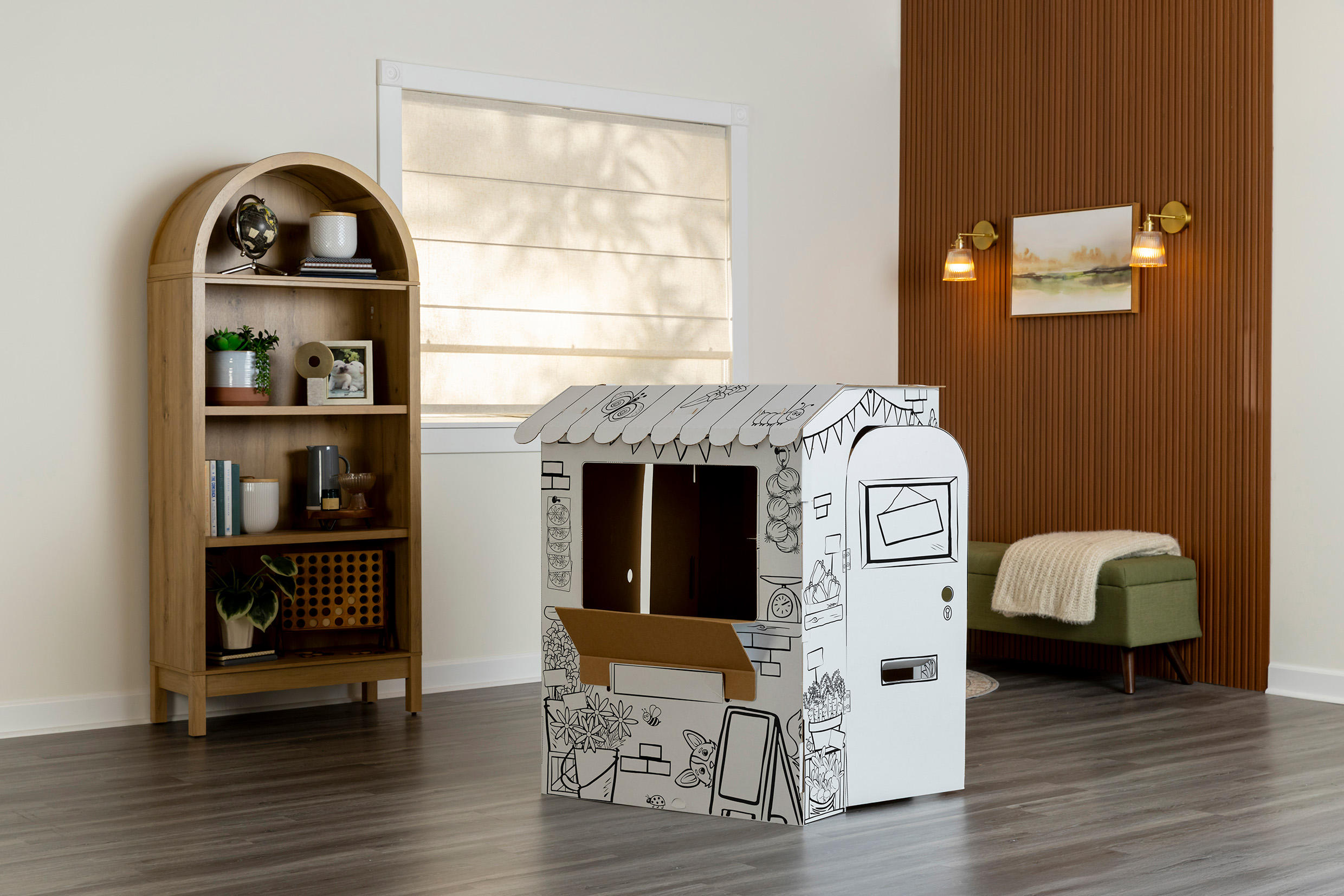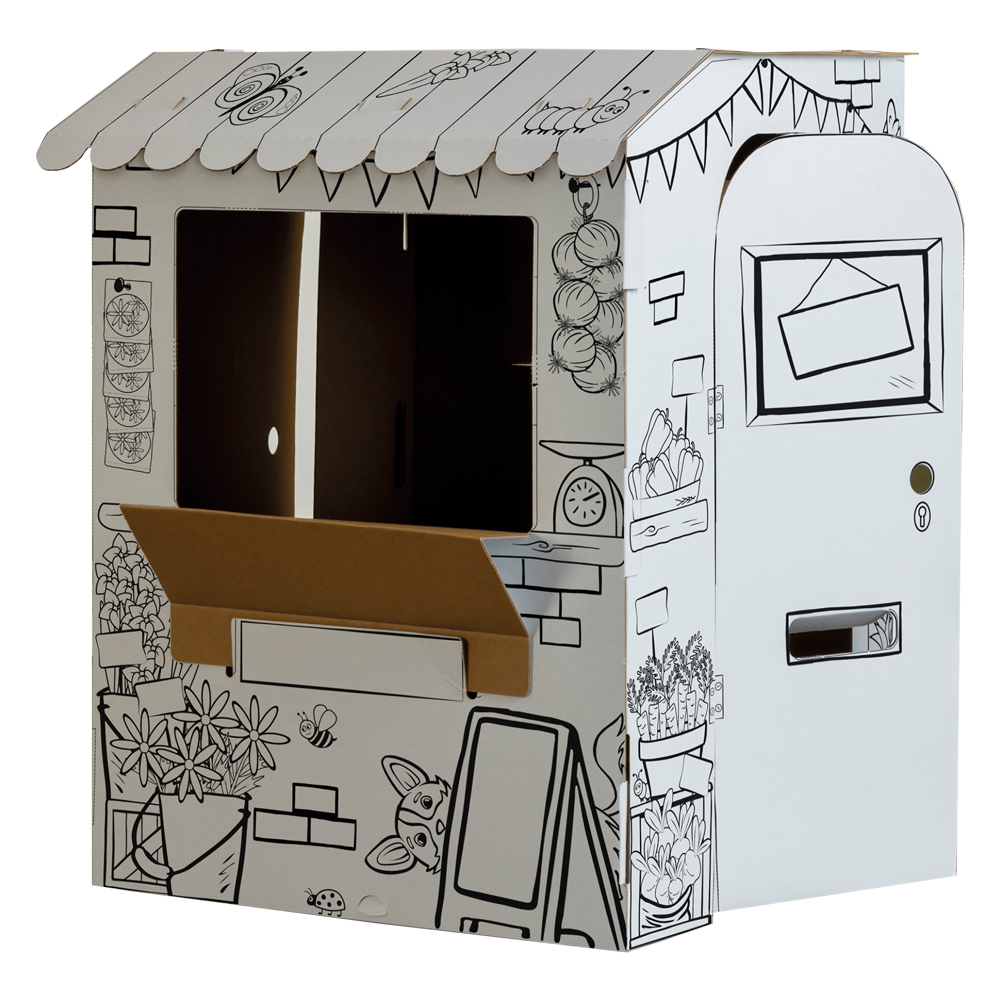 Domek z tektury falistej – trwały, z atrakcyjnym nadrukiem do kolorowania, rozwija wyobraźnię i zachęca dzieci do wspólnej zabawy:
