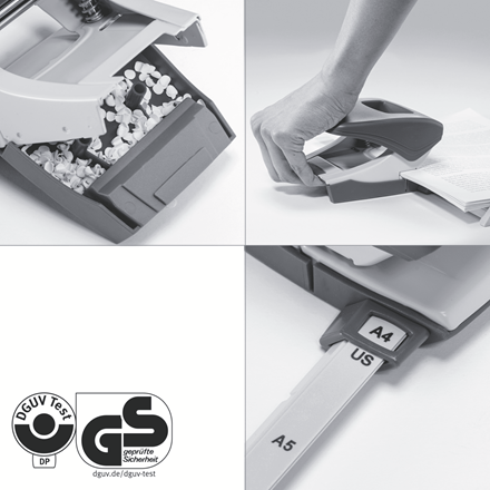 - Wyraźne oznaczenia formatu i wytrzymała prowadnica zapewniają perfekcyjne wyrównanie papieru