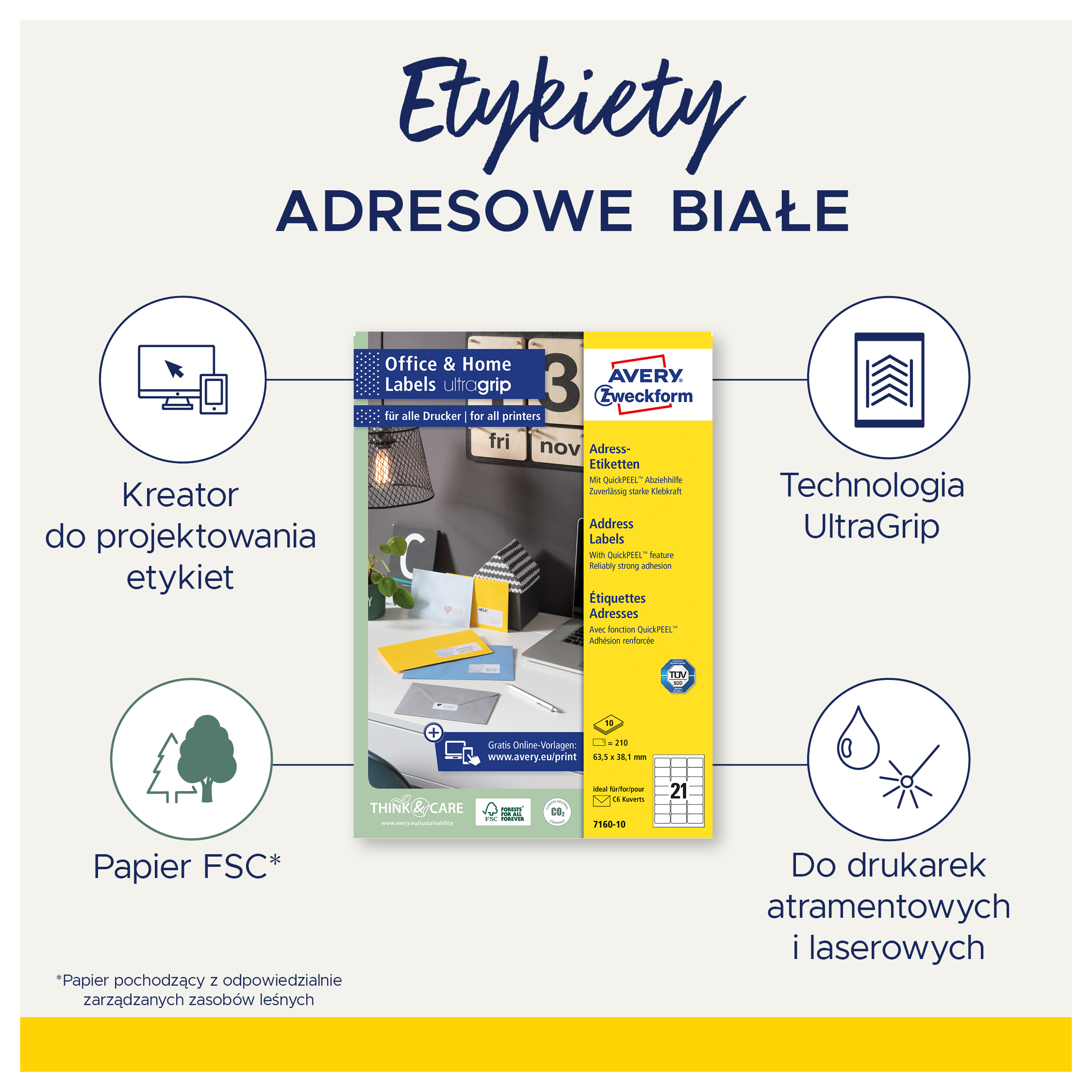 Etykiety adresowe Avery 7160-10 - 63,5 x 38,1 mm, 10 arkuszy - biały