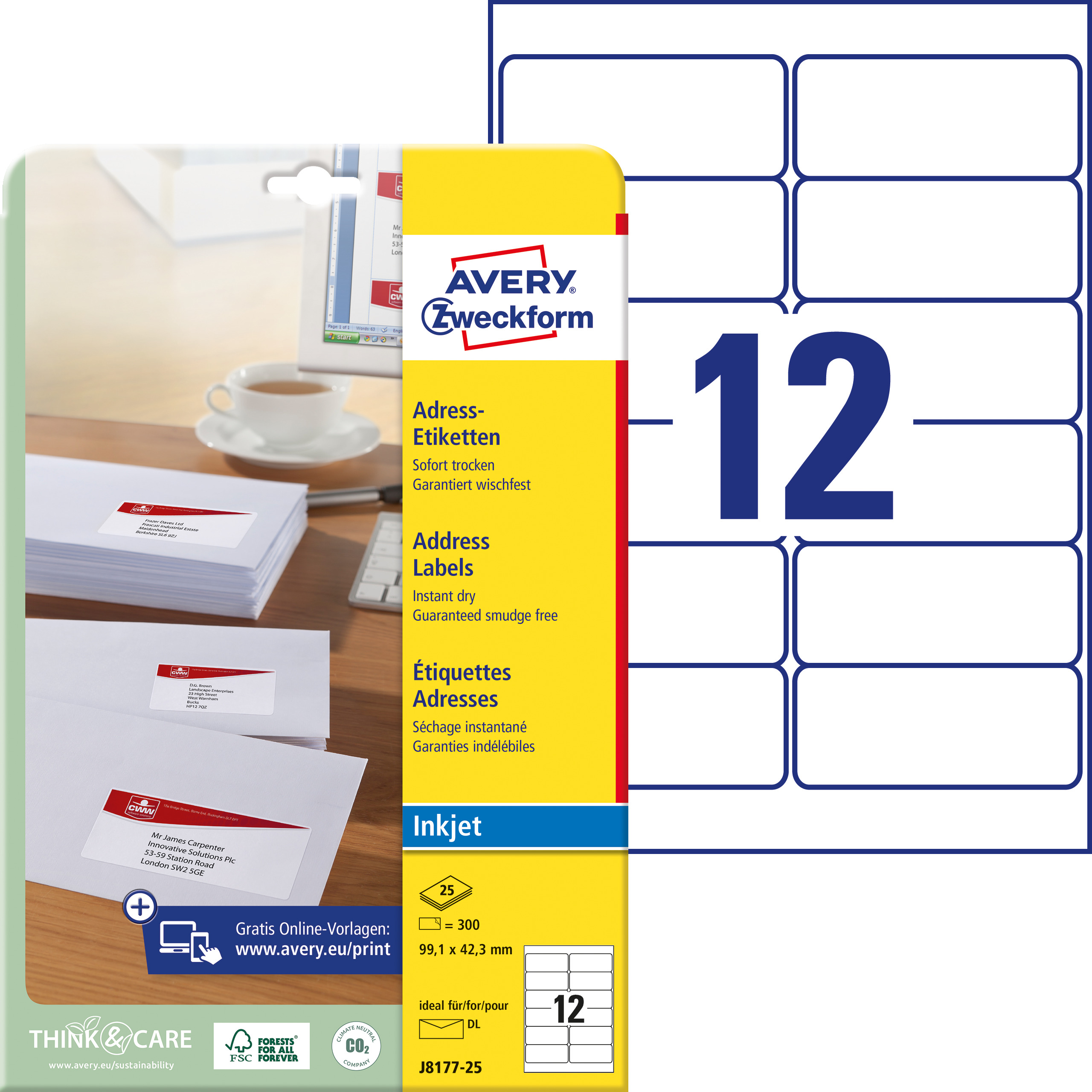 Etykiety adresowe Avery J8177-25 - 99,1 x 42,3 mm, 25 arkuszy - biały
