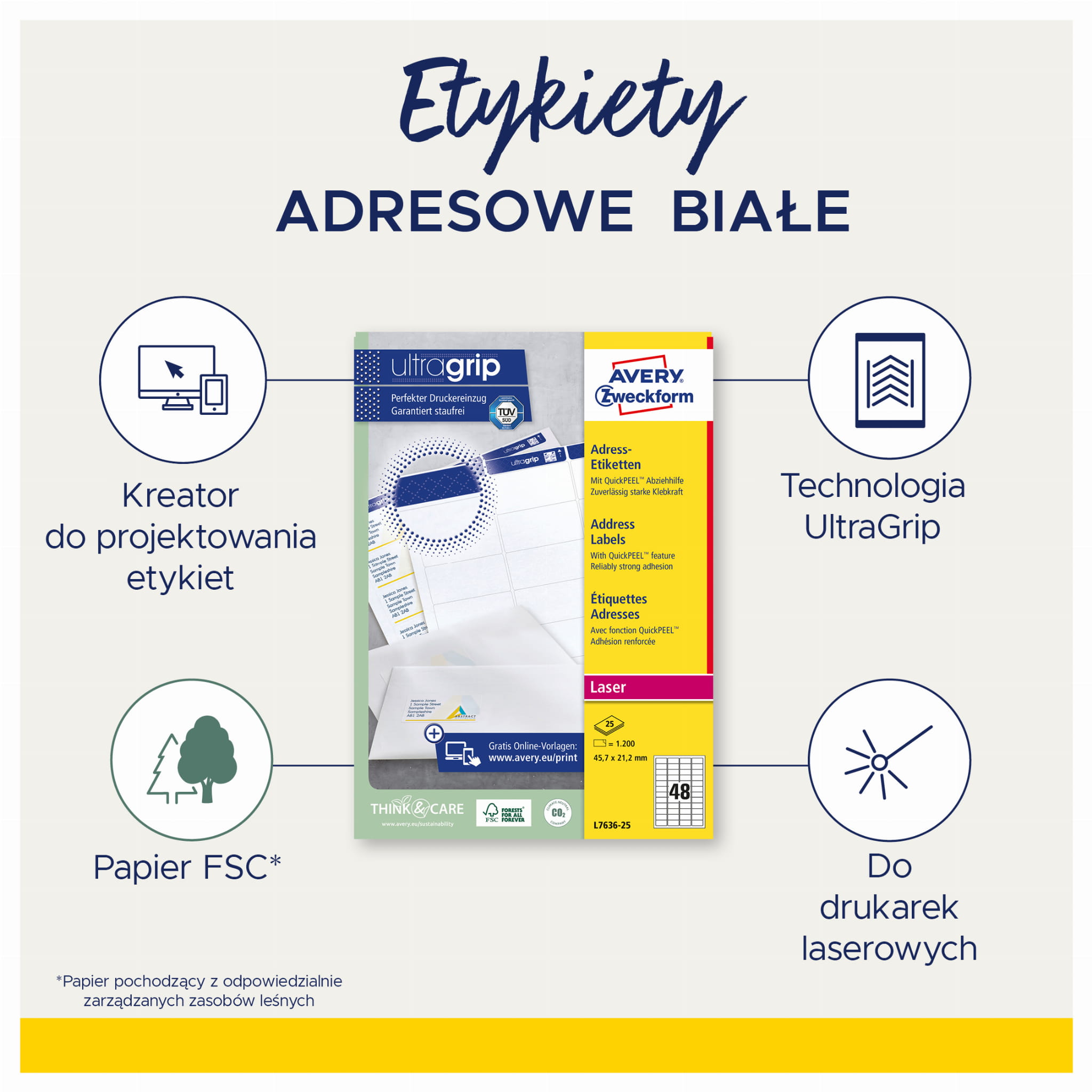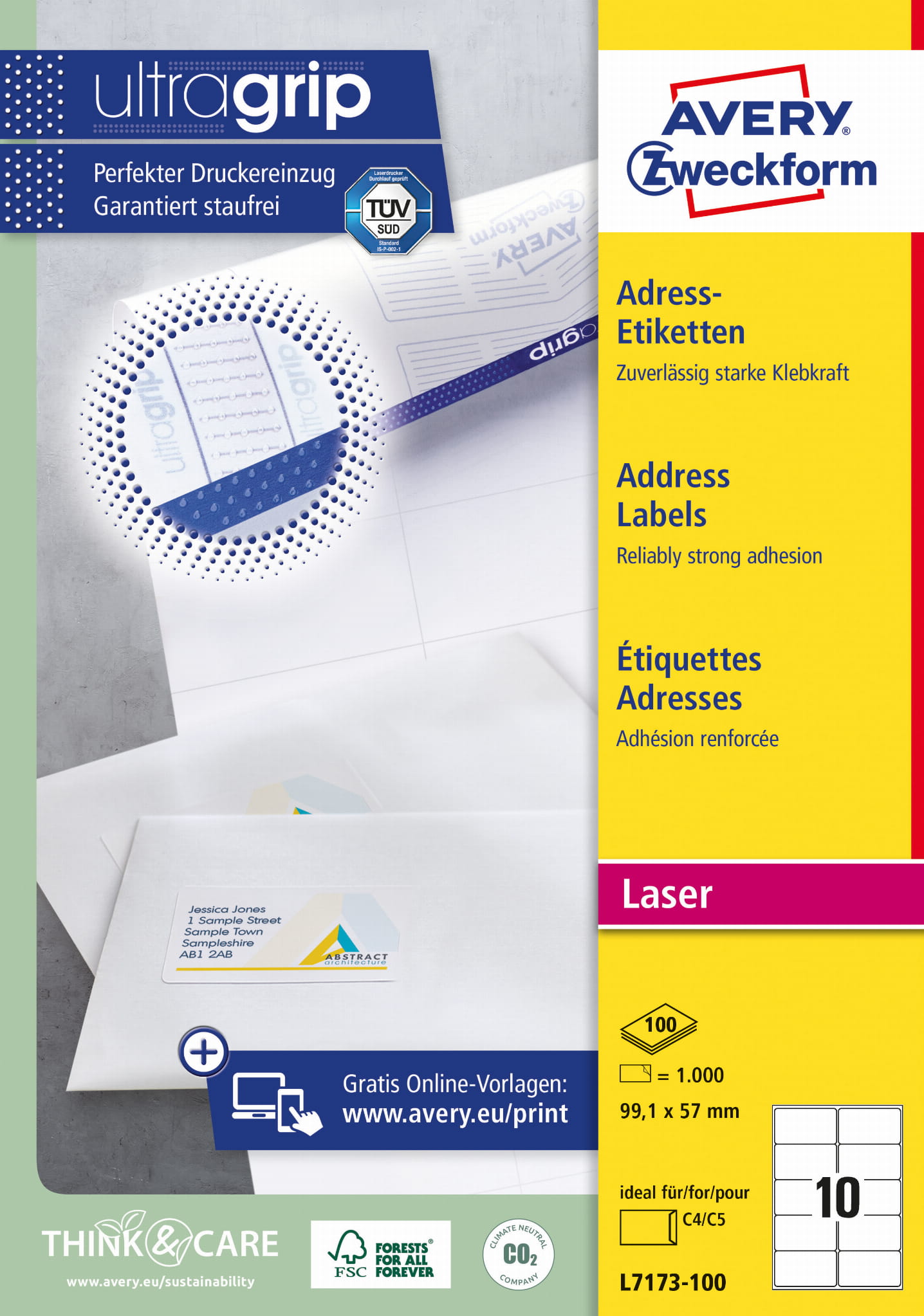 Białe etykiety adresowe L7173-100 do drukarek laserowych, w formacie 99,1x57mm od AVERY ZWECKFORM są odpowiednie np. do adresowania kopert C4/C5. 1000 etykiet adresowych w opakowaniu na 100 arkuszach, posiadają certyfikat FSC®. Dzięki innowacyjnej technologii ultragrip masz pewność precyzyjnego prowadzenia arkusza w drukarce oraz gwarancję braku zacięć. Etykiety posiadają także unikalną krawędź QCT zapobiegającą wydostawaniu się kleju podczas drukowania, co chroni drukarkę przed uszkodzeniami.