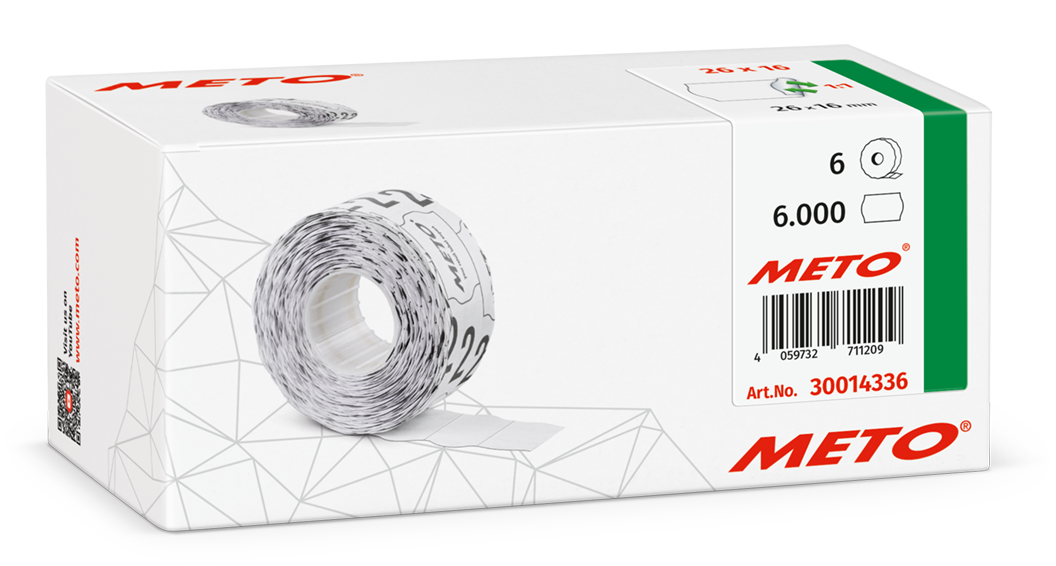Etykiety cenowe w rolce do metkownicy dwurzędowej, 26 x 16 mm, z klejem usuwalnym, metki METO M30014336 - 6 rolek / 6000 etykiet - białe
