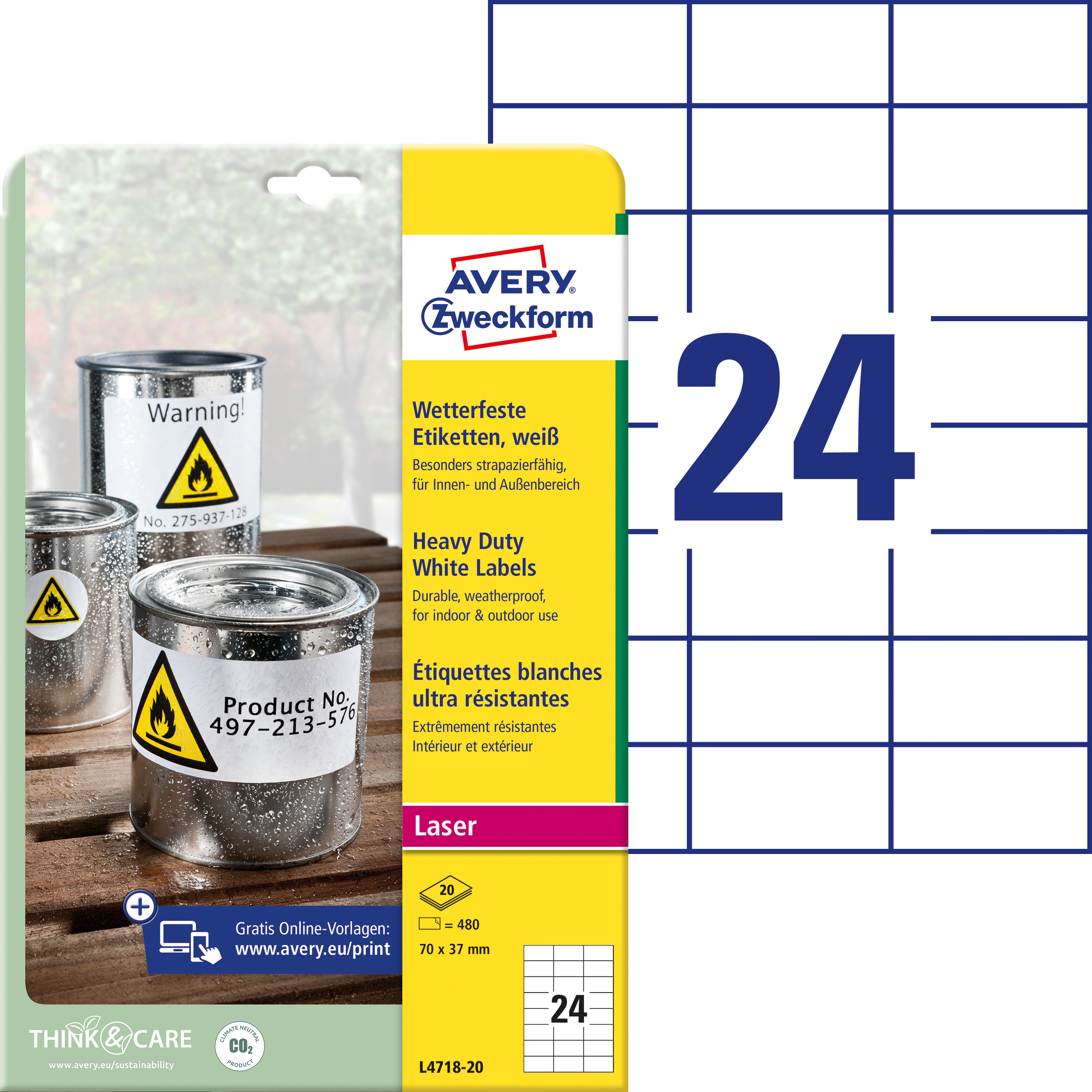 Etykiety foliowe, wodoodporne, trwałe Avery L4718-20 / 70 x 37 mm, 20 arkuszy - biały