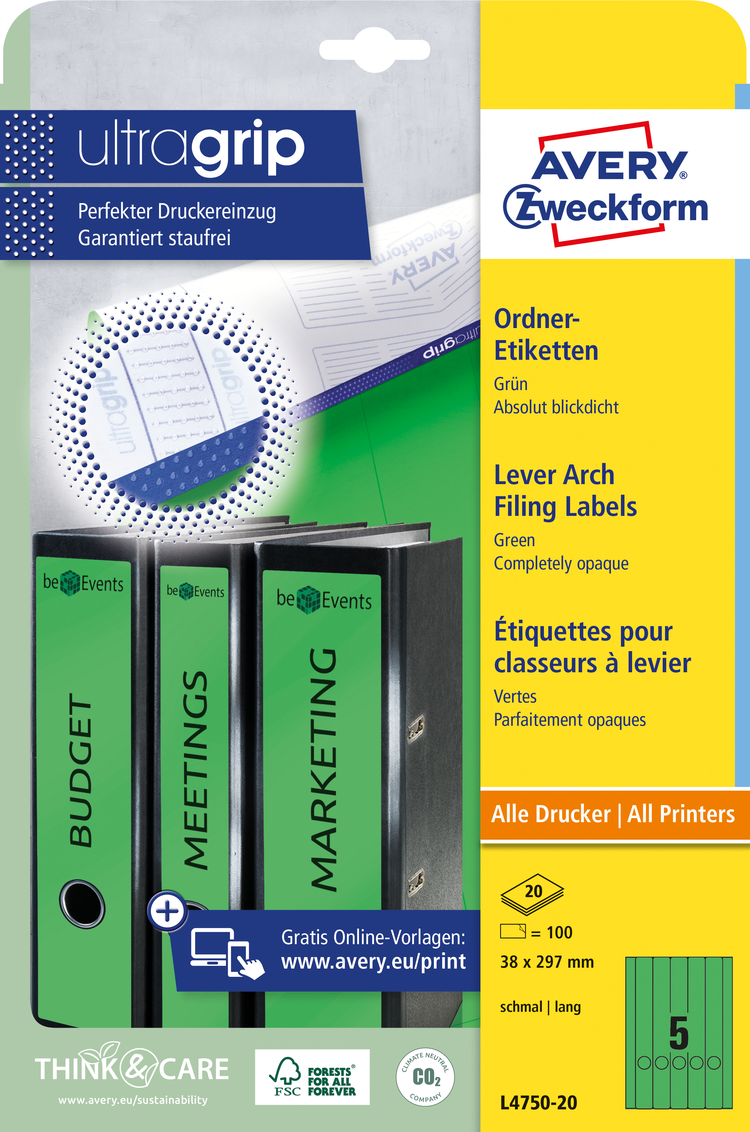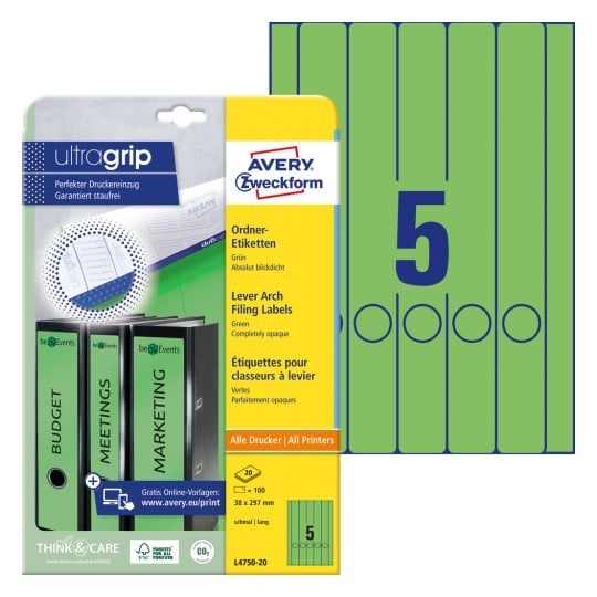 Etykiety na segregatory Avery L4750-20 - 38 x 297 mm, 20 arkuszy - zielony
