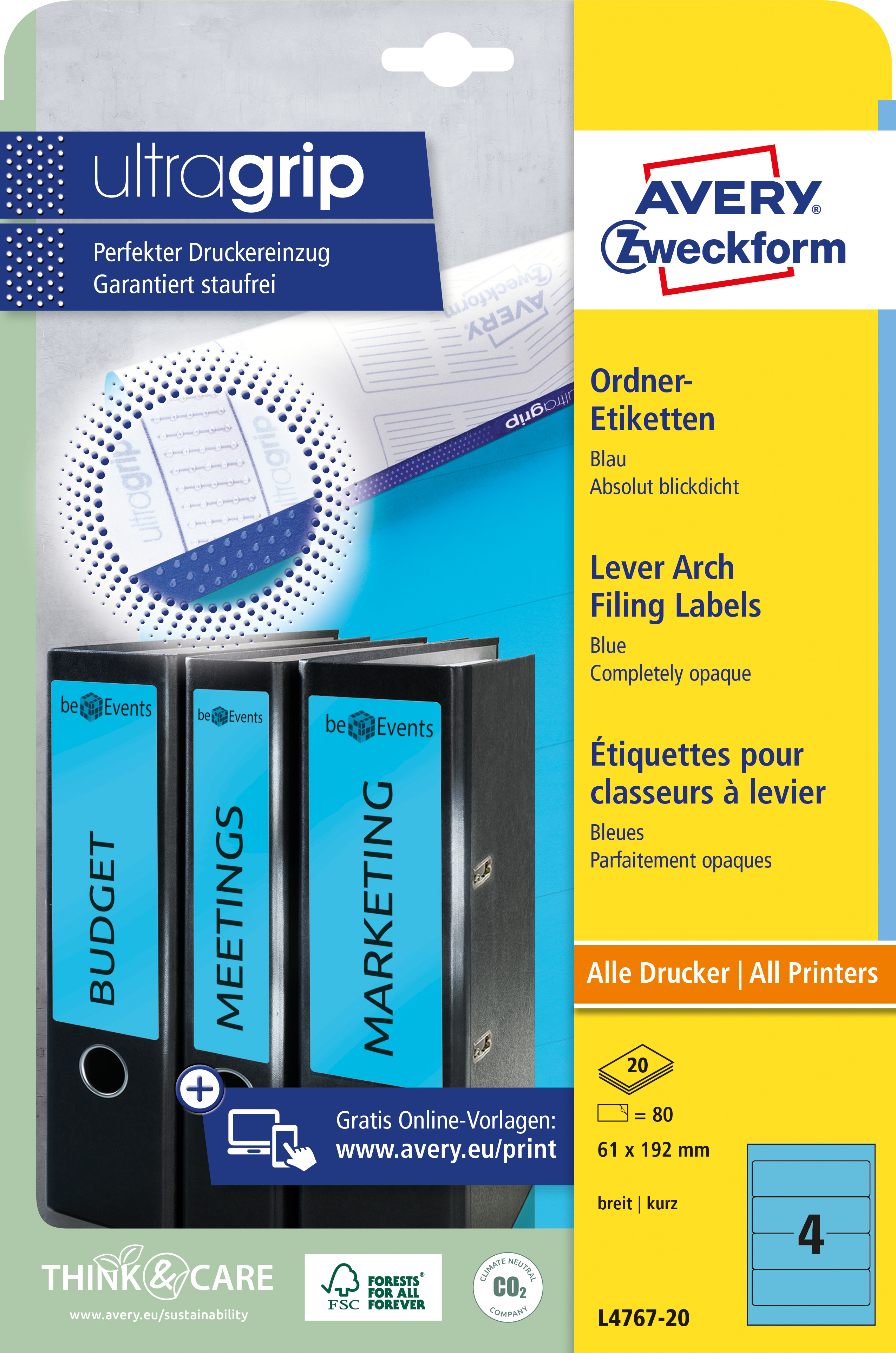 Etykiety na segregatory Avery L4767-20 - 61 x 192 mm, 20 arkuszy - niebieski