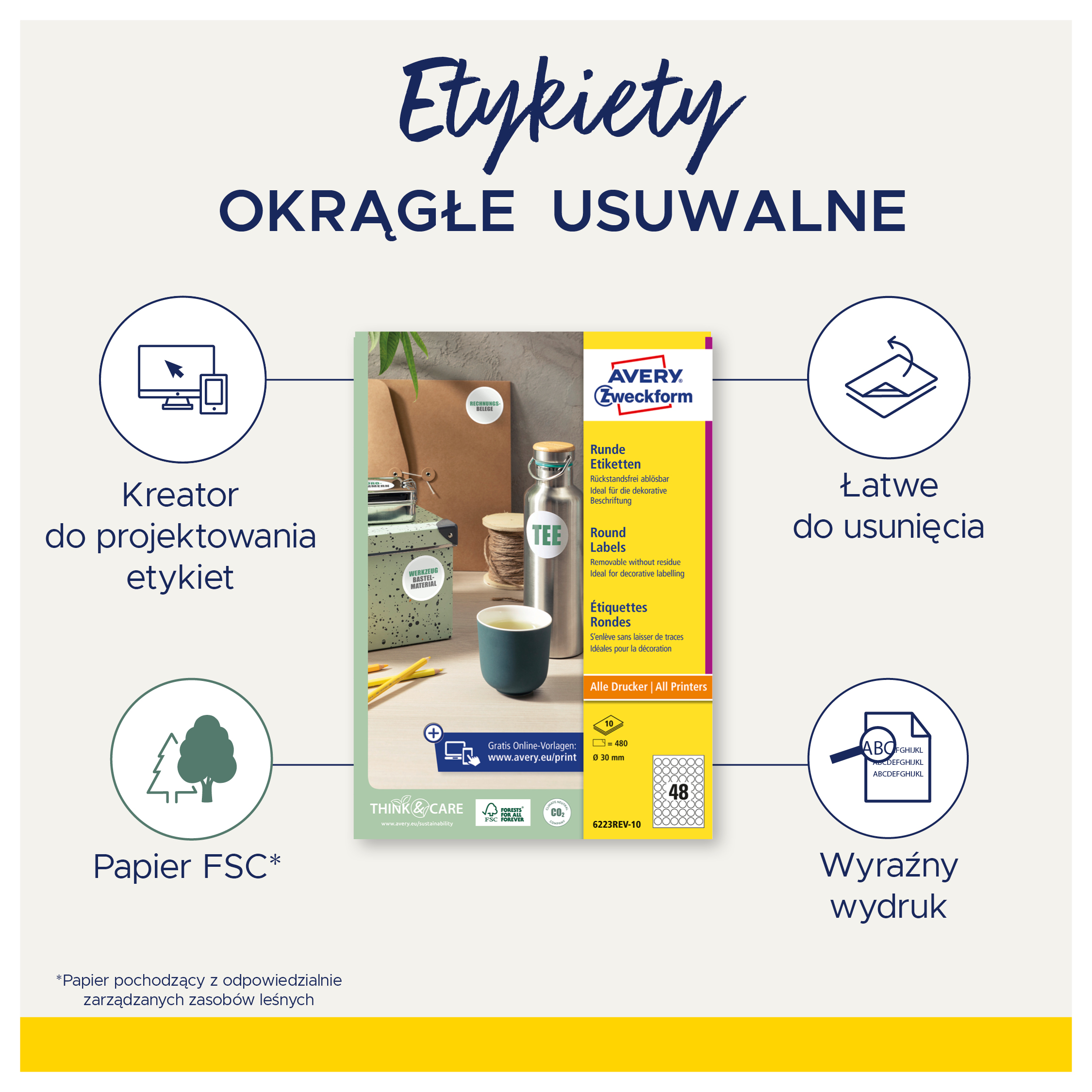 Etykiety papierowe Avery 6225REV-10 - Ø 51 mm, 10 arkuszy - biały