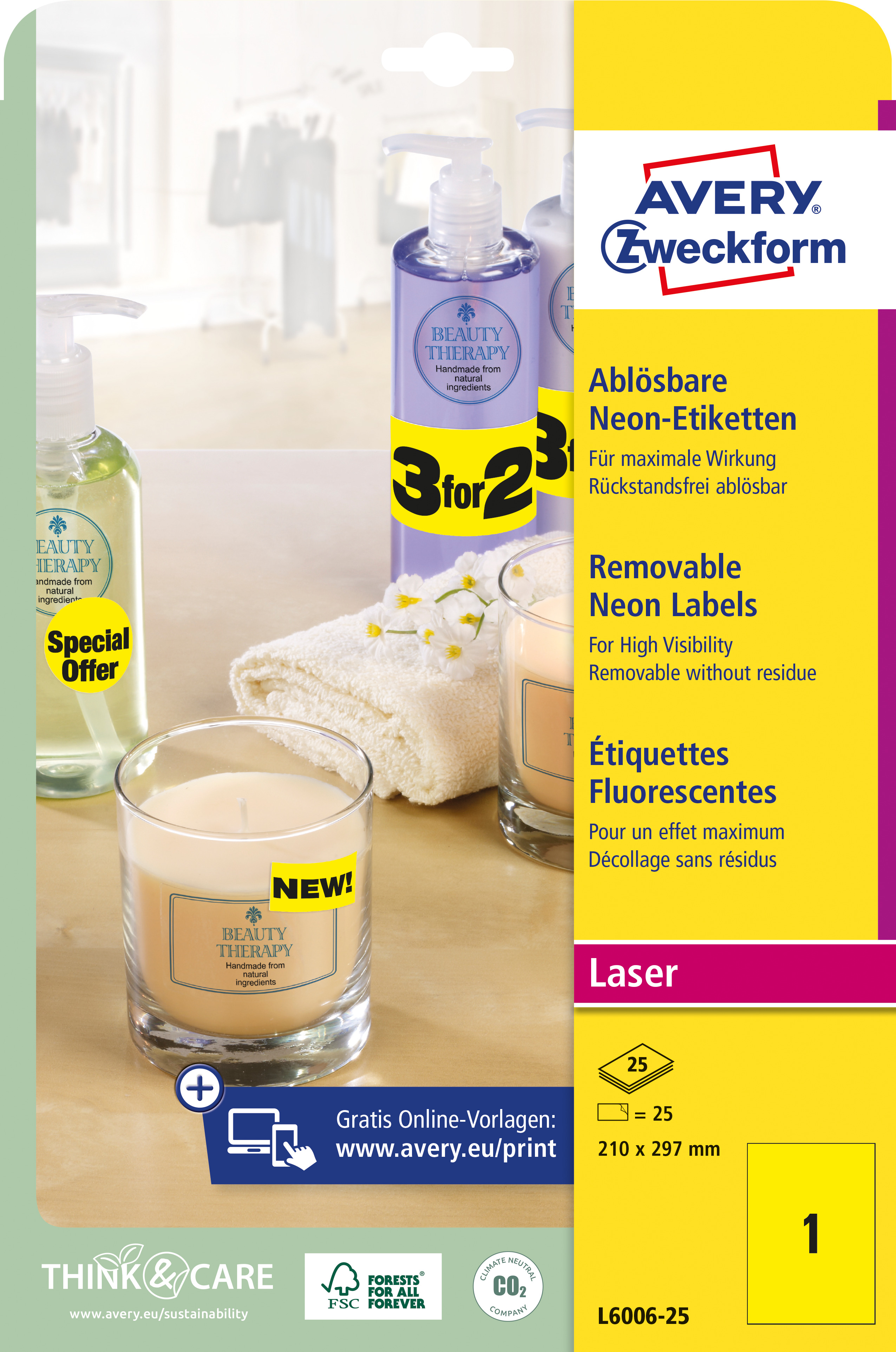 Etykiety papierowe Avery L6006-25 - 210 x 297 mm, 25 arkuszy - żółty neonowy