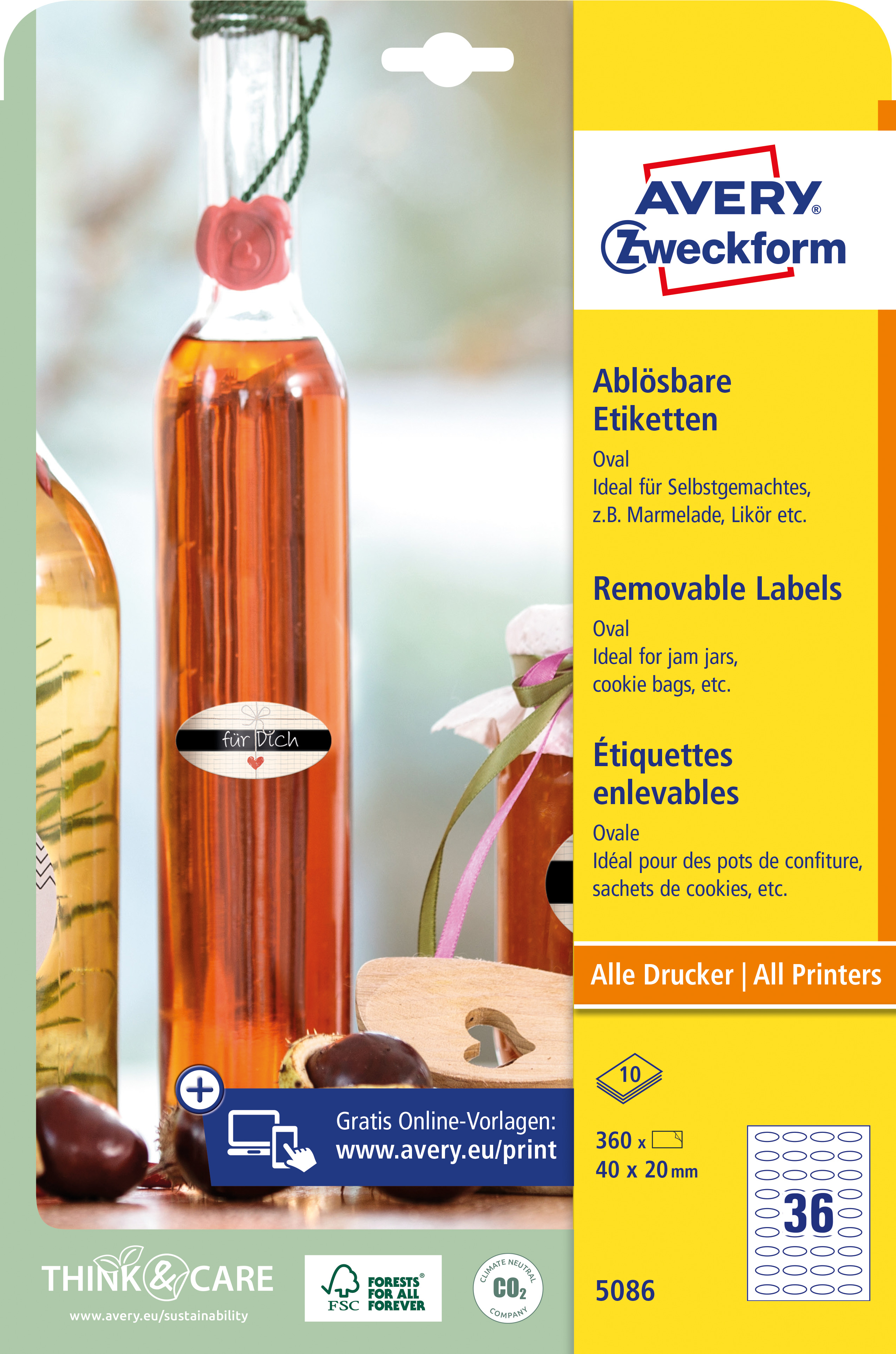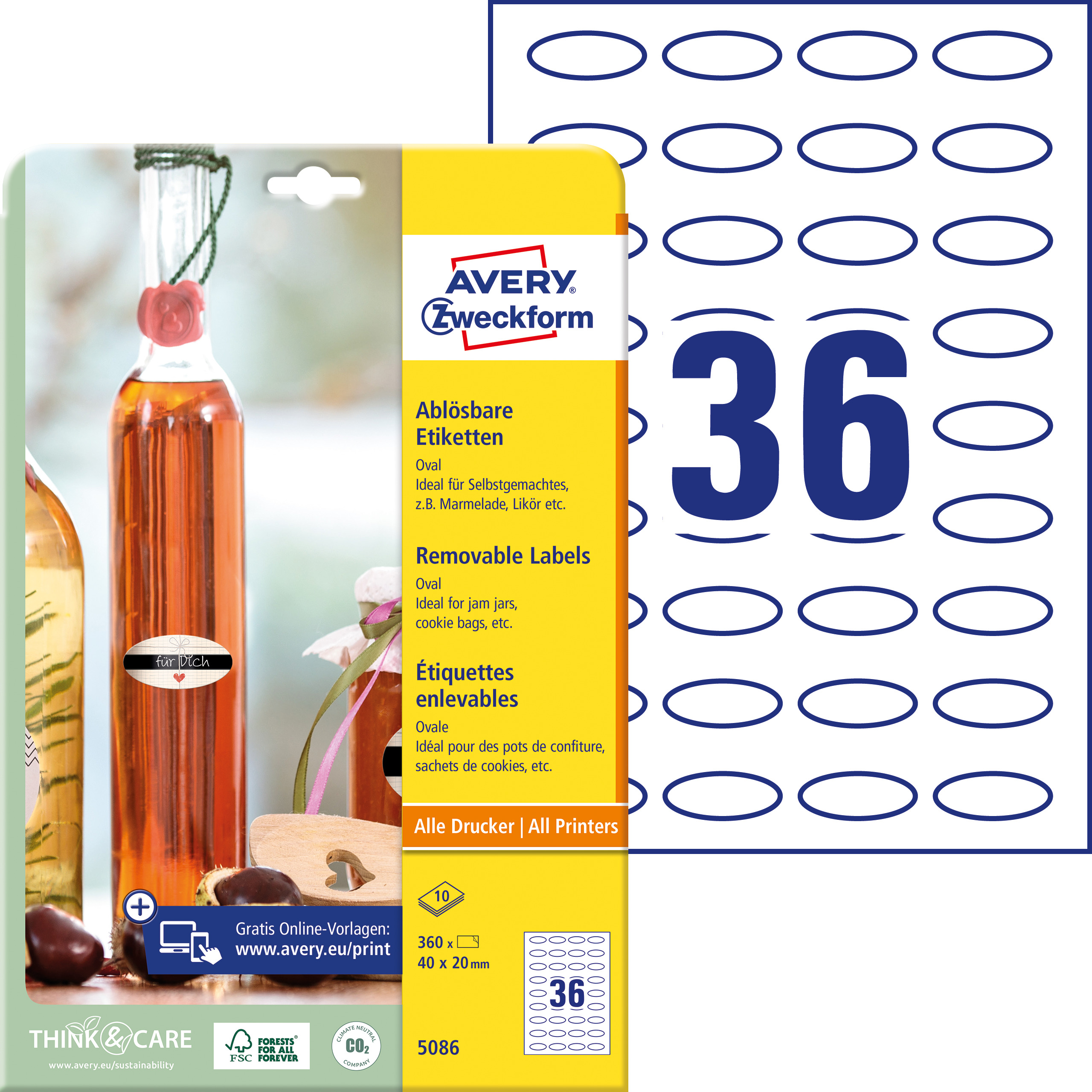 Etykiety papierowe owalne Avery 5086 - 40 x 20 mm, 10 arkuszy - biały