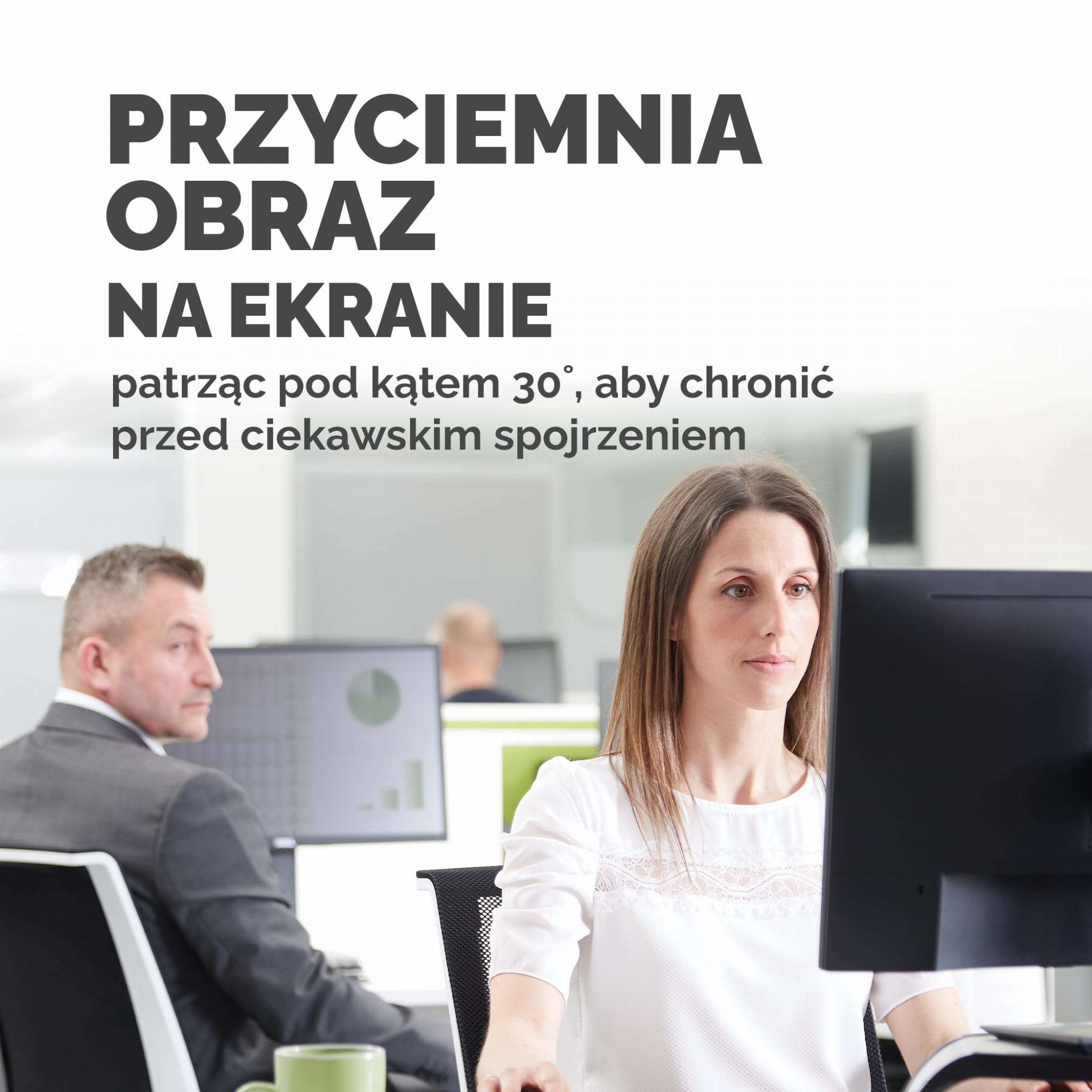 Ochrona danych wrażliwych i poufnych staje się koniecznością wraz ze wzrostem częstotliwości korzystania z urządzeń mobilnych w miejscach publicznych. “Podglądacze przez ramię” jak ich nazwano, stają się coraz powszechniejszym sposobem wykradania poufnych danych firmowych i prywatnych. Dane są spisywane lub robione jest zdjęcie ekranu w miejscach publicznych czy nawet w trakcie spotkań biznesowych. Jeżeli zamierzasz korzystać ze smartfona, laptopa czy tabletu w miejscu publicznym: w kawiarni, pociągu czy sklepie, filtry prywatyzujące Fellowes PrivaScreen™ ochronią Twoje dane. Osoba spoglądająca z boku pod kątem 30° zobaczy tylko czarny ekran. Dane będą widoczne tylko dla osoby znajdującej się bezpośrednio na wprost ekranu.