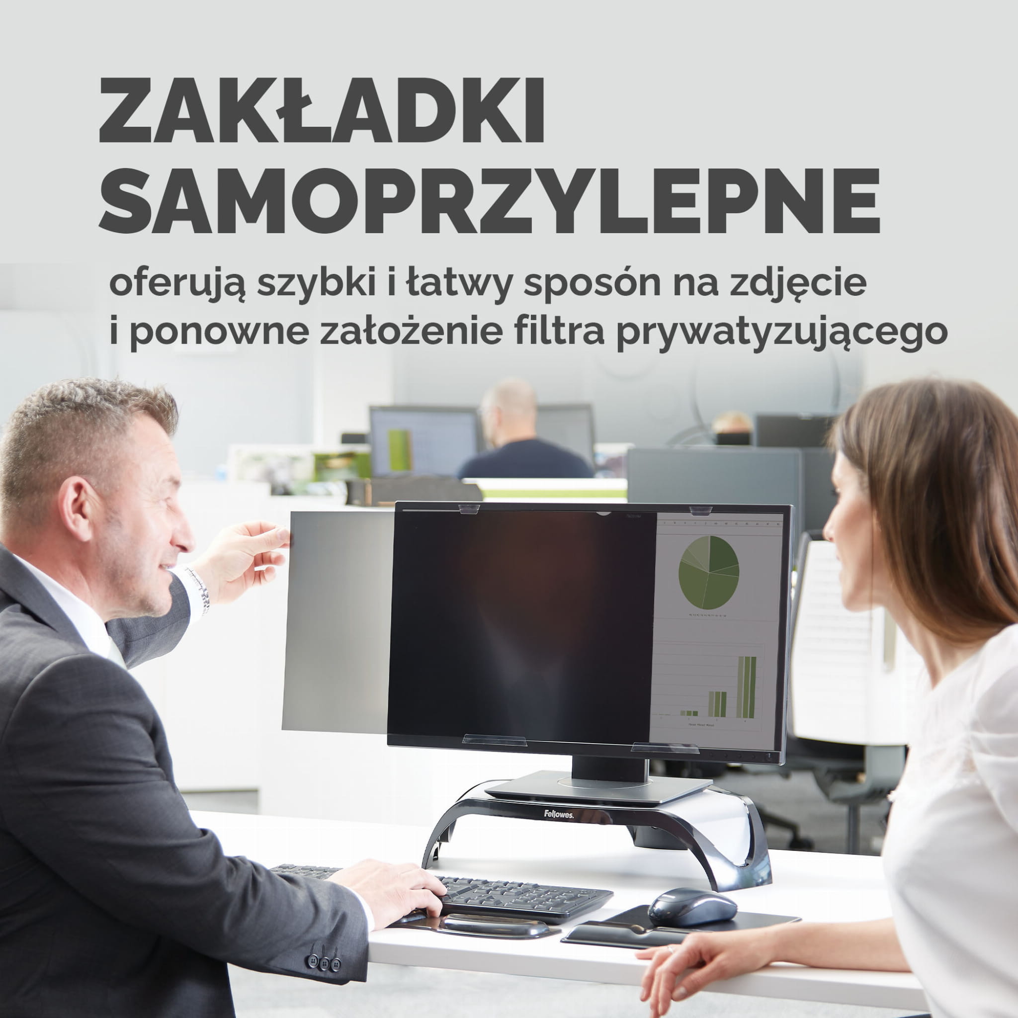 Ochrona danych wrażliwych i poufnych staje się koniecznością wraz ze wzrostem częstotliwości korzystania z urządzeń mobilnych w miejscach publicznych. “Podglądacze przez ramię” jak ich nazwano, stają się coraz powszechniejszym sposobem wykradania poufnych danych firmowych i prywatnych. Dane są spisywane lub robione jest zdjęcie ekranu w miejscach publicznych czy nawet w trakcie spotkań biznesowych. Jeżeli zamierzasz korzystać ze smartfona, laptopa czy tabletu w miejscu publicznym: w kawiarni, pociągu czy sklepie, filtry prywatyzujące Fellowes PrivaScreen™ ochronią Twoje dane. Osoba spoglądająca z boku pod kątem 30° zobaczy tylko czarny ekran. Dane będą widoczne tylko dla osoby znajdującej się bezpośrednio na wprost ekranu.