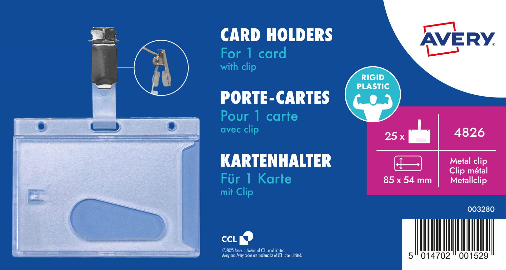 25 przezroczystych holderów z klipsem na karty o kodzie: 4826 od Avery, w formacie 85 x 54 mm. Praktyczna i idealna do długotrwałego użytkowania wytrzymała obudowa z tworzywa sztucznego. Dzięki formatowi 85 x 54 mm do holderów idealnie pasują wszystkie standardowe karty. Klips umożliwia łatwe przymocowanie holderu do ubrania lub torby.