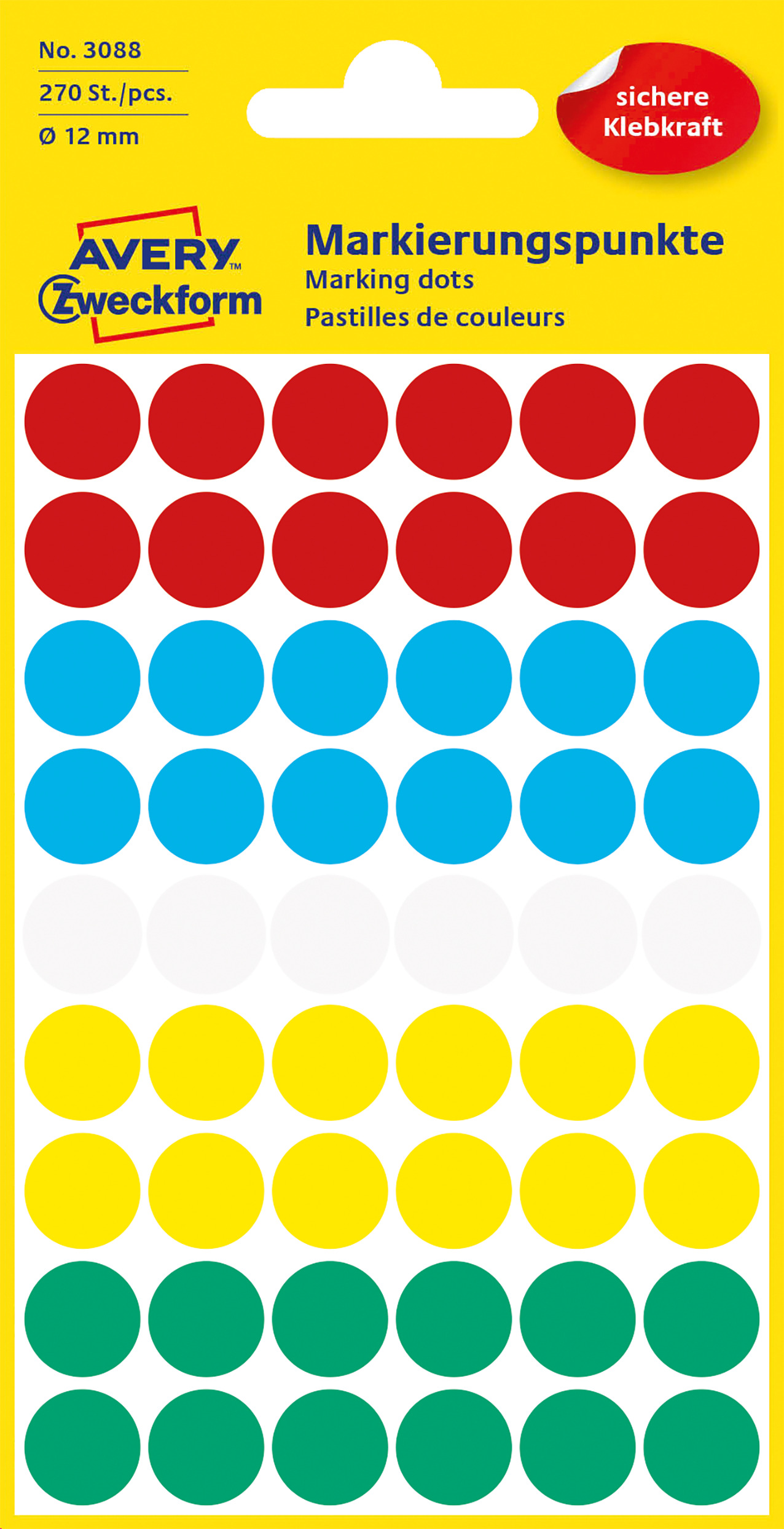 Kółka do zaznaczania Avery 3088 - Ø 12 mm, 270 etyk., 5 arkuszy - wielokolorowy