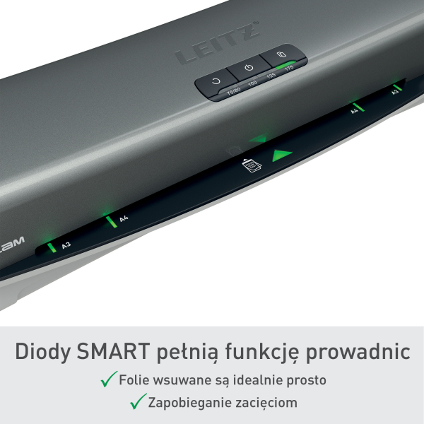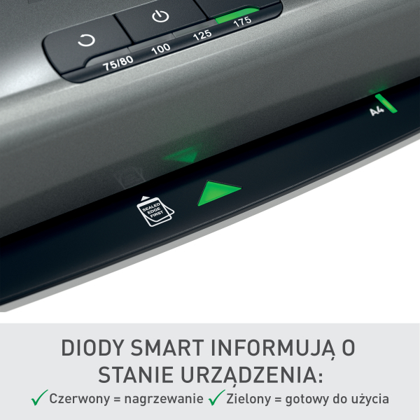 Innowacyjna dioda SMART informuje o stanie urządzenia przy użyciu sygnałów wizualnych i dźwiękowych: kolor czerwony oznacza nagrzewanie, kolor zielony wraz z sygnałem dźwiękowym - gotowość do pracy, a pulsujący kolor czerwony - funkcję automatycznego wyłączania po 15 minutach bezczynności. Dodatkowo, diody SMART pełniące funkcję prowadnic zapewniają prawidłowe wyrównane folii, co zapobiega zacięciom i czyni każdą laminację idealną.