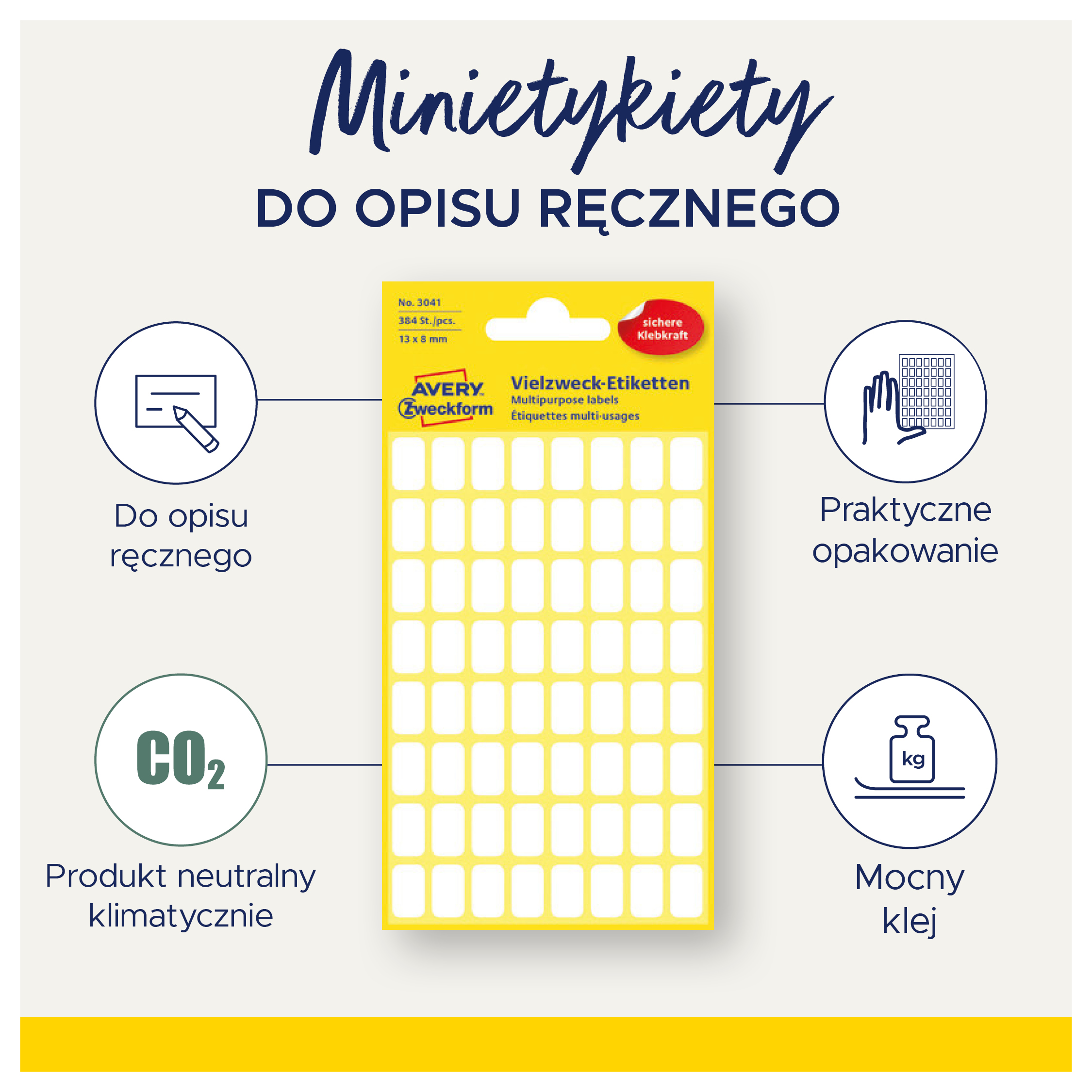 Minietykiety do opisywania ręcznego 38 x 29 mm, trwałe etykiety papierowe, białe etykiety samoprzylepne 40 etyk., 5 ark. /op., Avery 3078