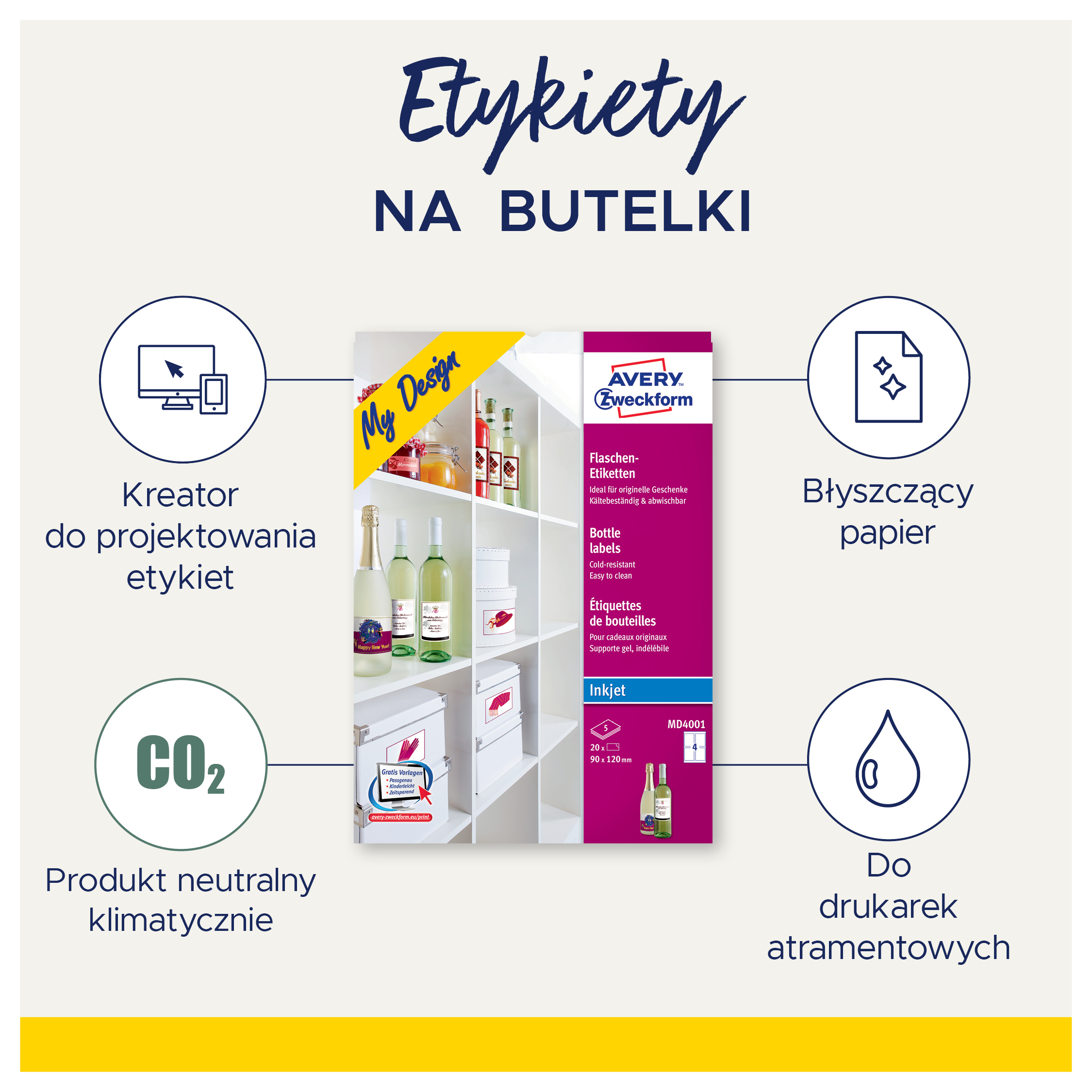 Naklejki na butelki, etykiety samoprzylepne Avery MD4001 / 90 x 120 mm, 5 arkuszy - biały