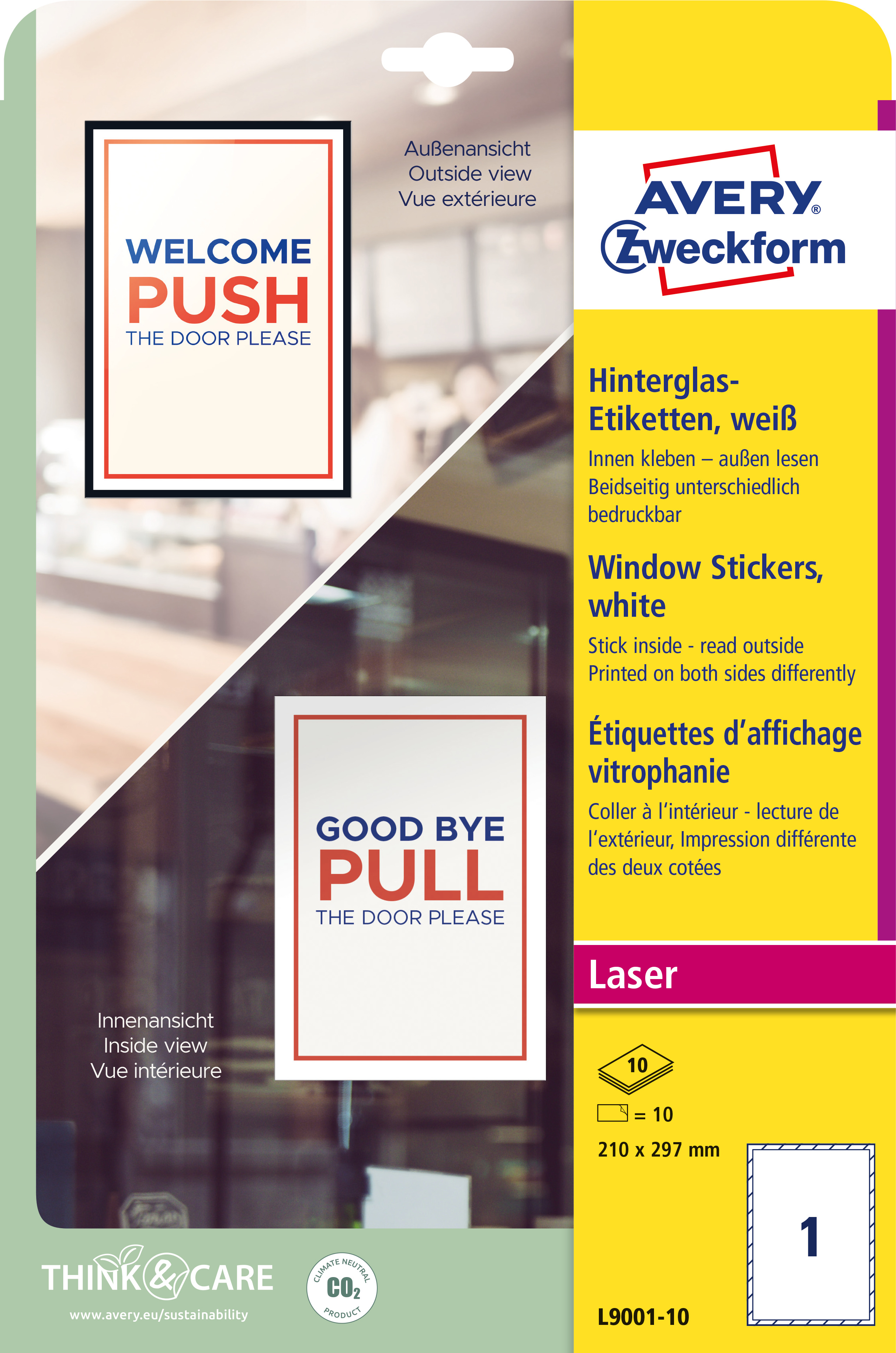 Naklejki na szyby Avery L9001-10 - 210 x 297 mm, 10 arkuszy - biały