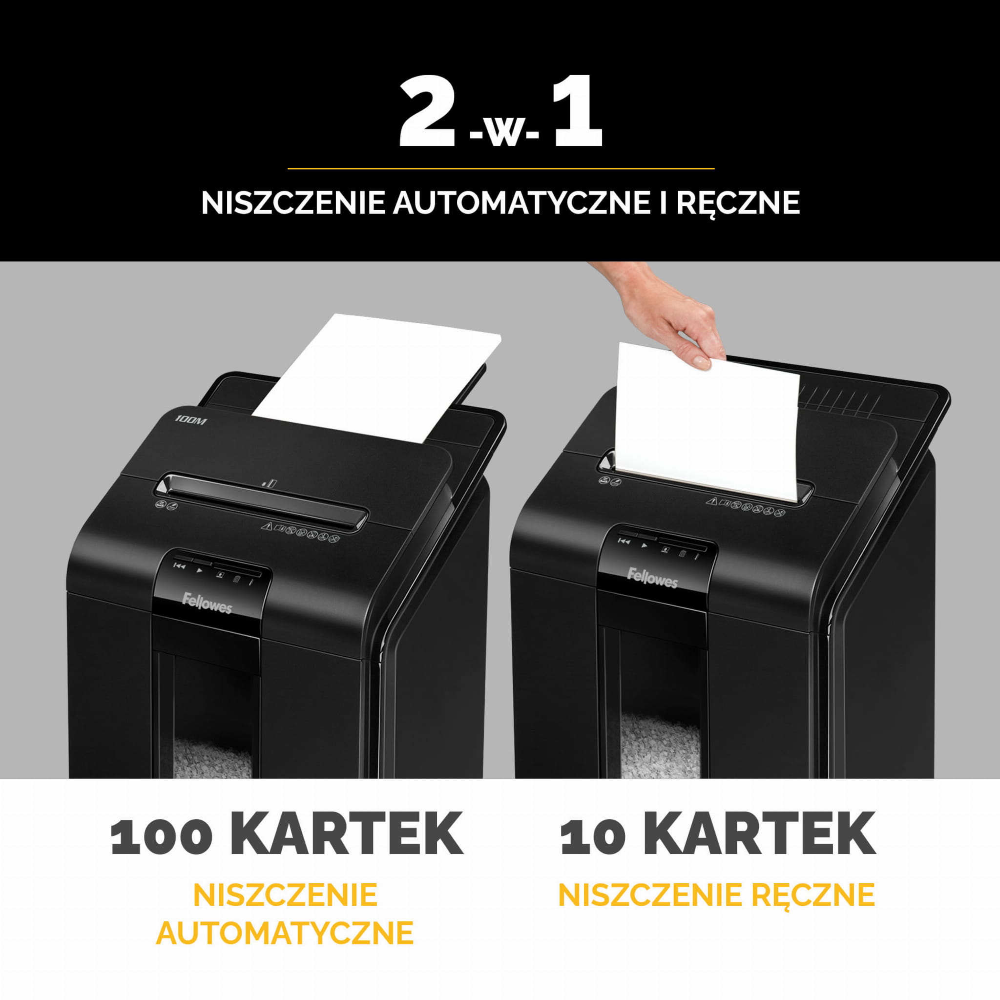 - Niszczy automatycznie do 100 kartek oraz do 10 kartek w trybie podajnika ręcznego.
