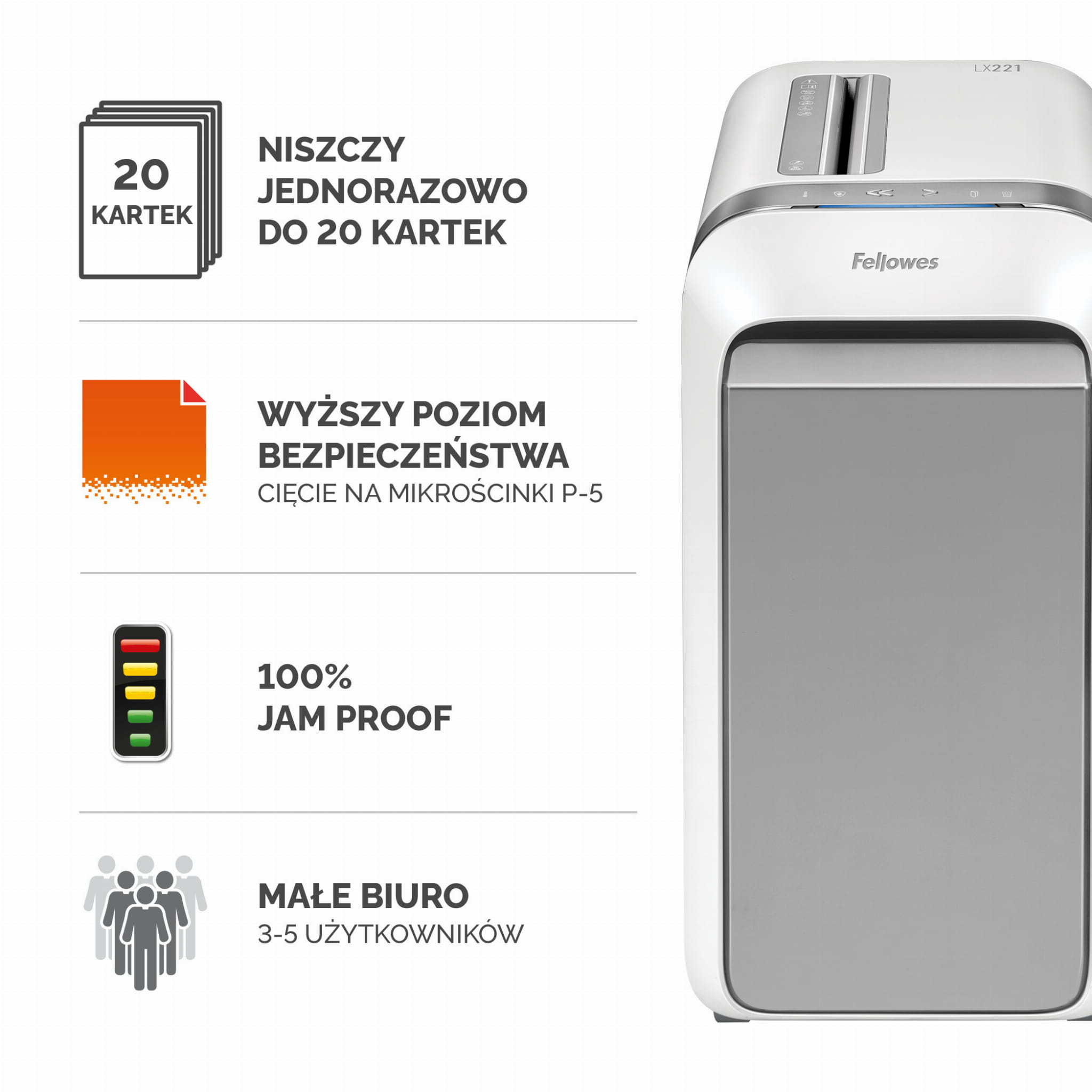 | Ilość ark. niszczonych jednorazowo | 20 kartek A4 (70g) |