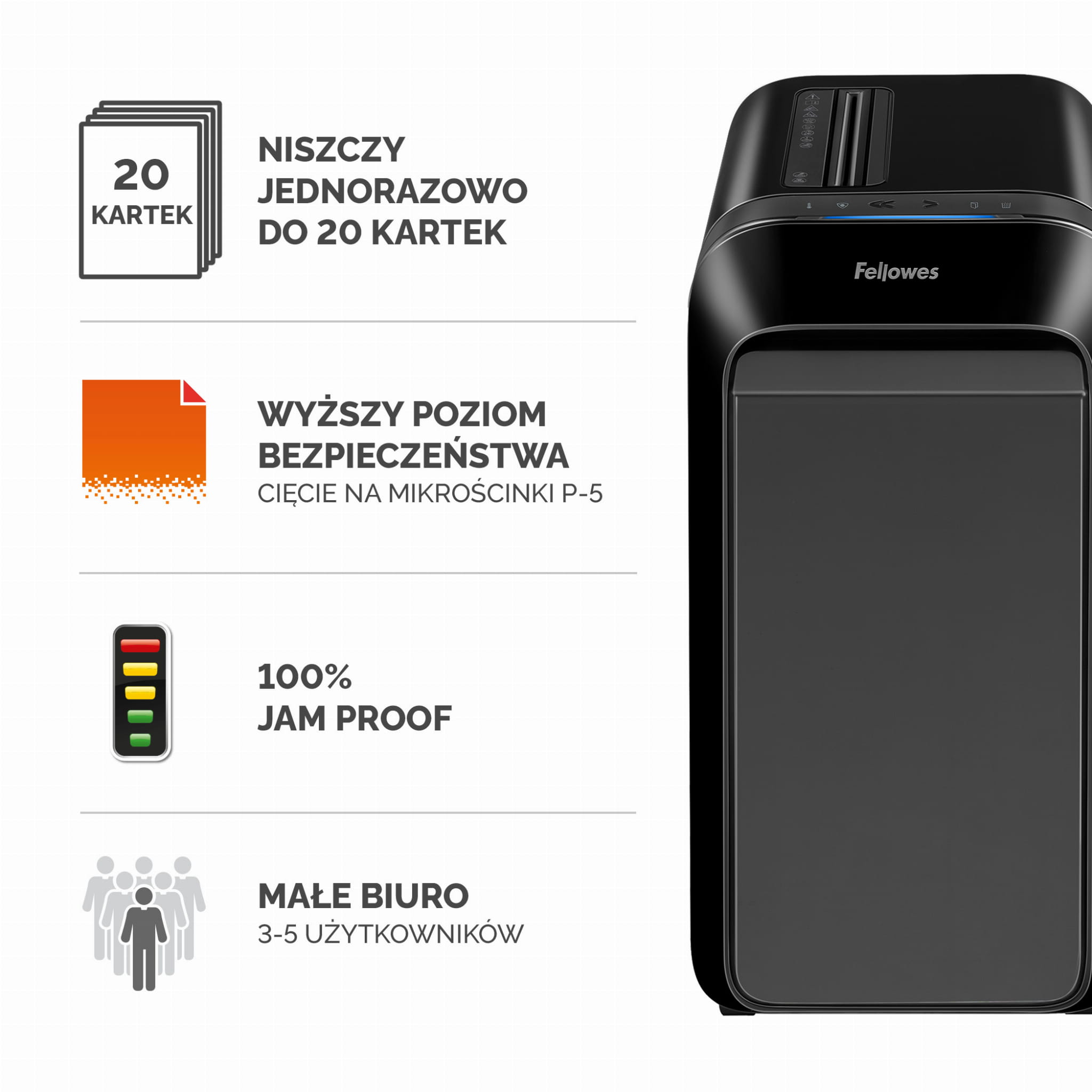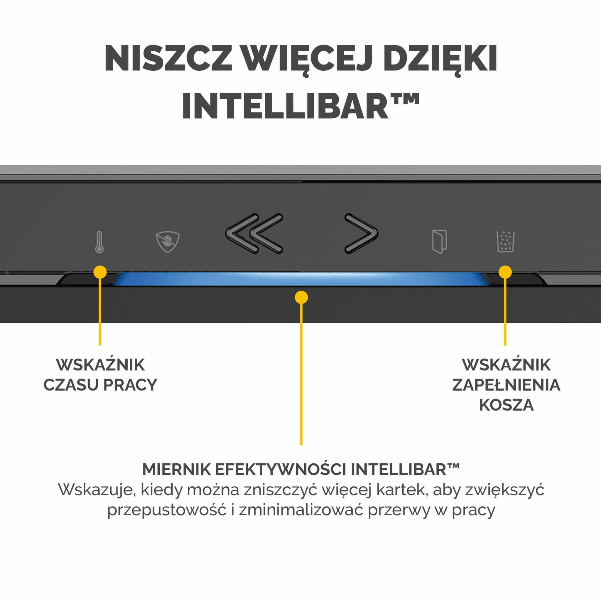 Innowacyjna technologia komunikacji z użytkownikiem IntelliBar™ posiada 5 funkcji, które zapewniają eliminację zacięć, bezpieczeństwo, wysoką wydajność i łatwość niszczenia