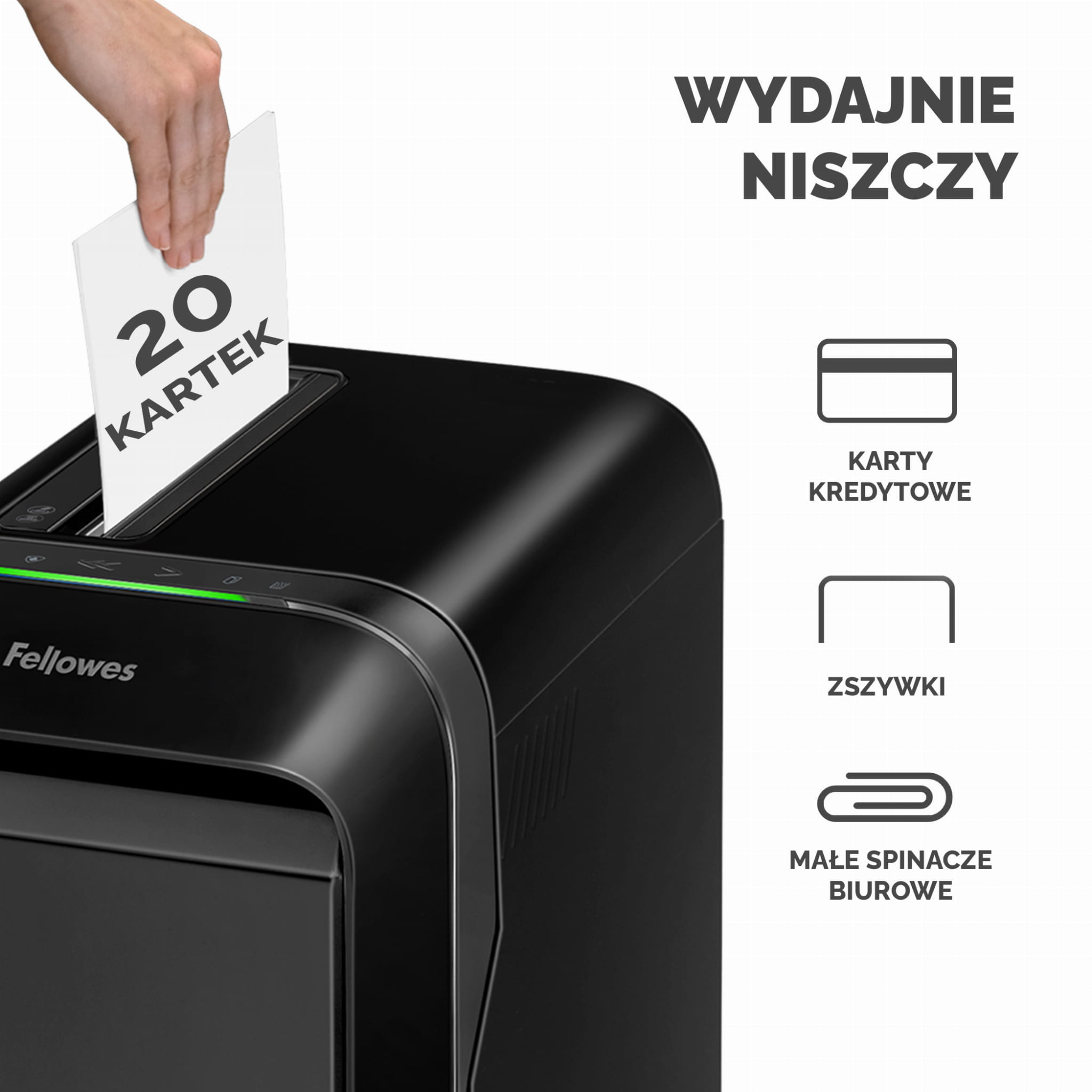 - Może niszczyć dokumenty ze zszywkami i małymi spinaczami, karty kredytowe