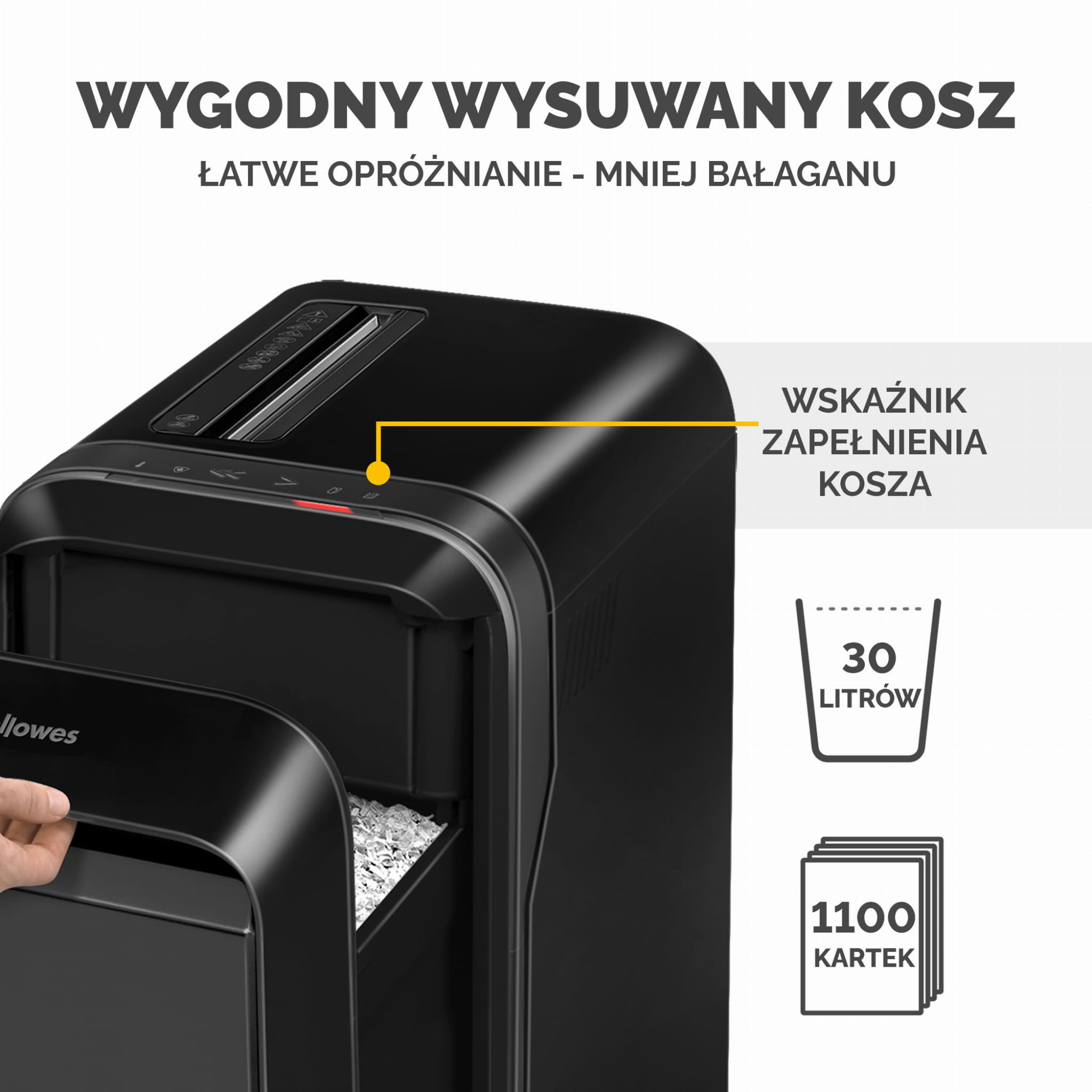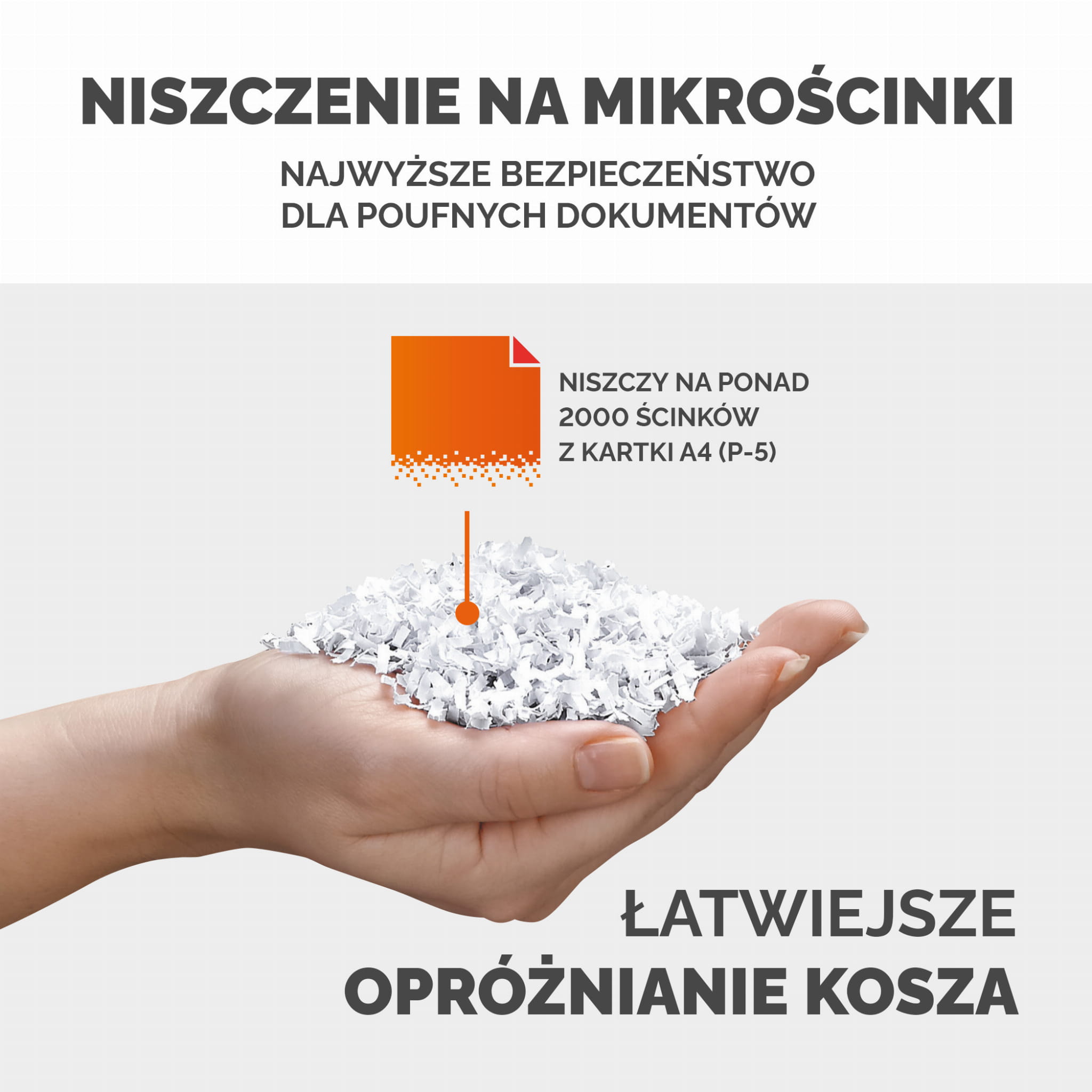 - Cięcie na mikrościnki pozwala na pomieszczenie większej ilości zniszczonych dokumentów w koszu