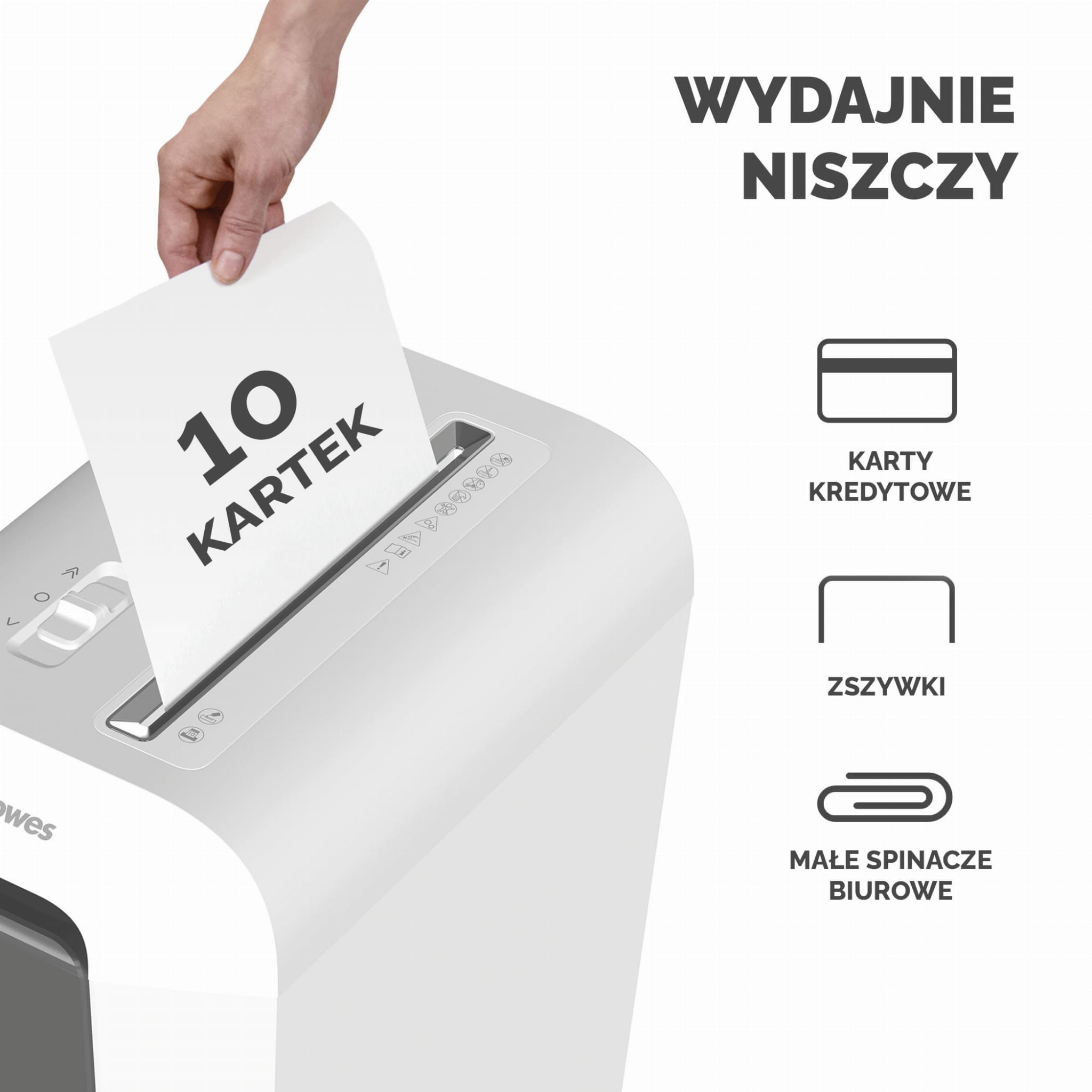 - Niszczy jednorazowo do 10 kartek A4 (70g) na ścinki 4×40 mm (P-4/T-4)