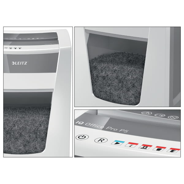 Nowoczesną niszczarkę Leitz Office Pro wyróżnia stylowe wzornictwo, wydajność, niezwykle wysoki poziom bezpieczeństwa danych - DIN P5 oraz system kompaktowania ścinków. Przeznaczona do użytku biurowego. Wyposażona jest w technologię zapobiegania zacięciom, pracuje cicho i wydajnie. Niszczy do 15 kartek A4 jednocześnie, a na ścinki przeznaczony jest duży, 30-litrowy pojemnik. Wszystkie funkcje sterowane są za pomocą prostego w obsłudze panelu dotykowego. Niezwykle długi, 4-godzinny czas nieprzerwanej pracy urządzenia pozwala na szybkie i sprawne przeprowadzenie procesu niszczenia.