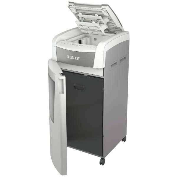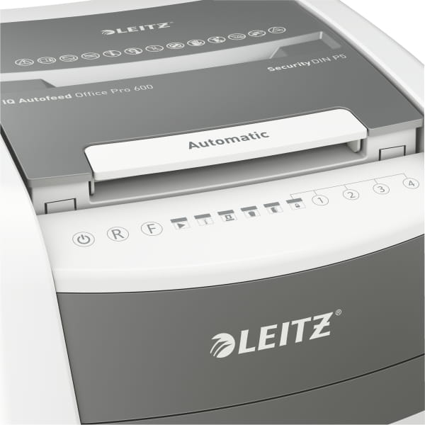 W pełni automatyczna niszczarka do papieru firmy Leitz z unikalną funkcją samooczyszczania. Tak inteligentna, że wystarczy włożyć stos kartek (w tym ze zszywkami i spinaczami), zamknąć pokrywę i można wracać do swoich zajęć, a ona, cicho pracując, wykona samodzielnie zadaną pracę. Gwarantuje doskonałą wydajność - zapobiega zacięciom, jest cicha i może pracować przez 240 minut bez przerwy. Jednorazowo niszczy automatycznie do 600 kartek formatu A4, tnąc je na mikrościnki o poziomie bezpieczeństwa P-5 (2 x 15 mm) i umieszczając pocięte arkusze w dużym, 110-litrowym pojemniku. Dotykowy panel sterowania gwarantuje łatwą i intuicyjną obsługę urządzenia.