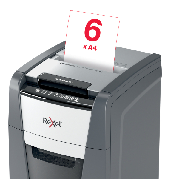 Niszczarka automatyczna do papieru Optimum AutoFeed+ 150M jednorazowo niszczy automatycznie do 150 kartek A4 (80 gsm), tnąc arkusze na mikrościnki (o wymiarach 2 x 15 mm), co zapewnia poziom bezpieczeństwa P-5. Wyposażona jest w automatyczny podajnik i 44-litrowy pojemnik na ścinki, co sprawia, że idealnie nadaje się do użytku biurowego. Nie wymaga ręcznego podawania papieru ani wcześniejszego usuwania zszywek i spinaczy - ta automatyczna niszczarka całą pracę wykona za Ciebie.