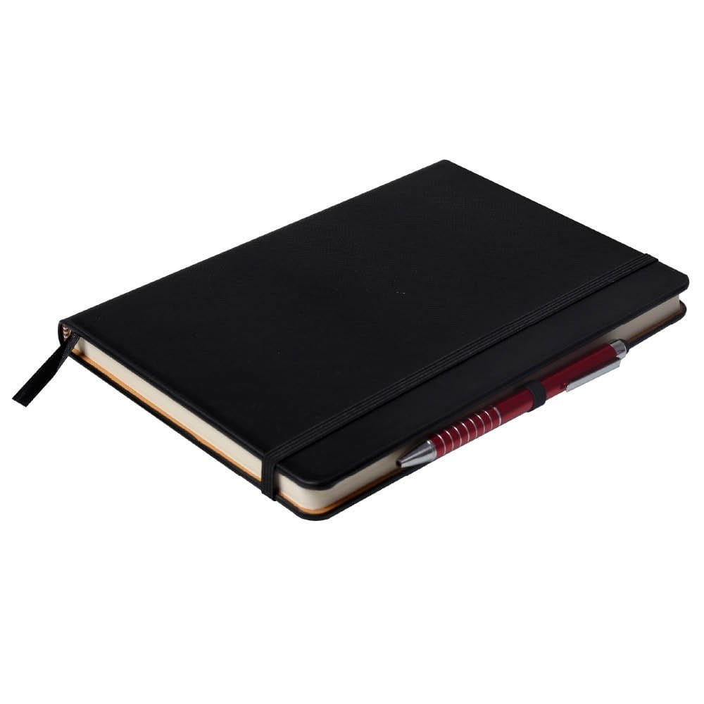 Notatnik biurowy twardy zamykany na gumkę w formacie A5 z miejscem na przechowywanie długopisu.