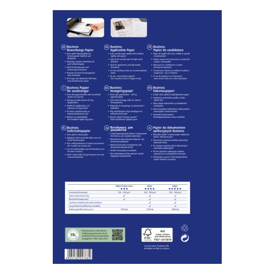 • Bielony bezchlorowo papier z certyfikatem FSC – Do wszystkich papierów używany jest papier pochodzący z odpowiedzialnie zarządzanych zasobów leśnych. Wytrzymałe i odporne na rozdarcia opakowanie jest wykonane z materiałów pochodzących z recyklingu.