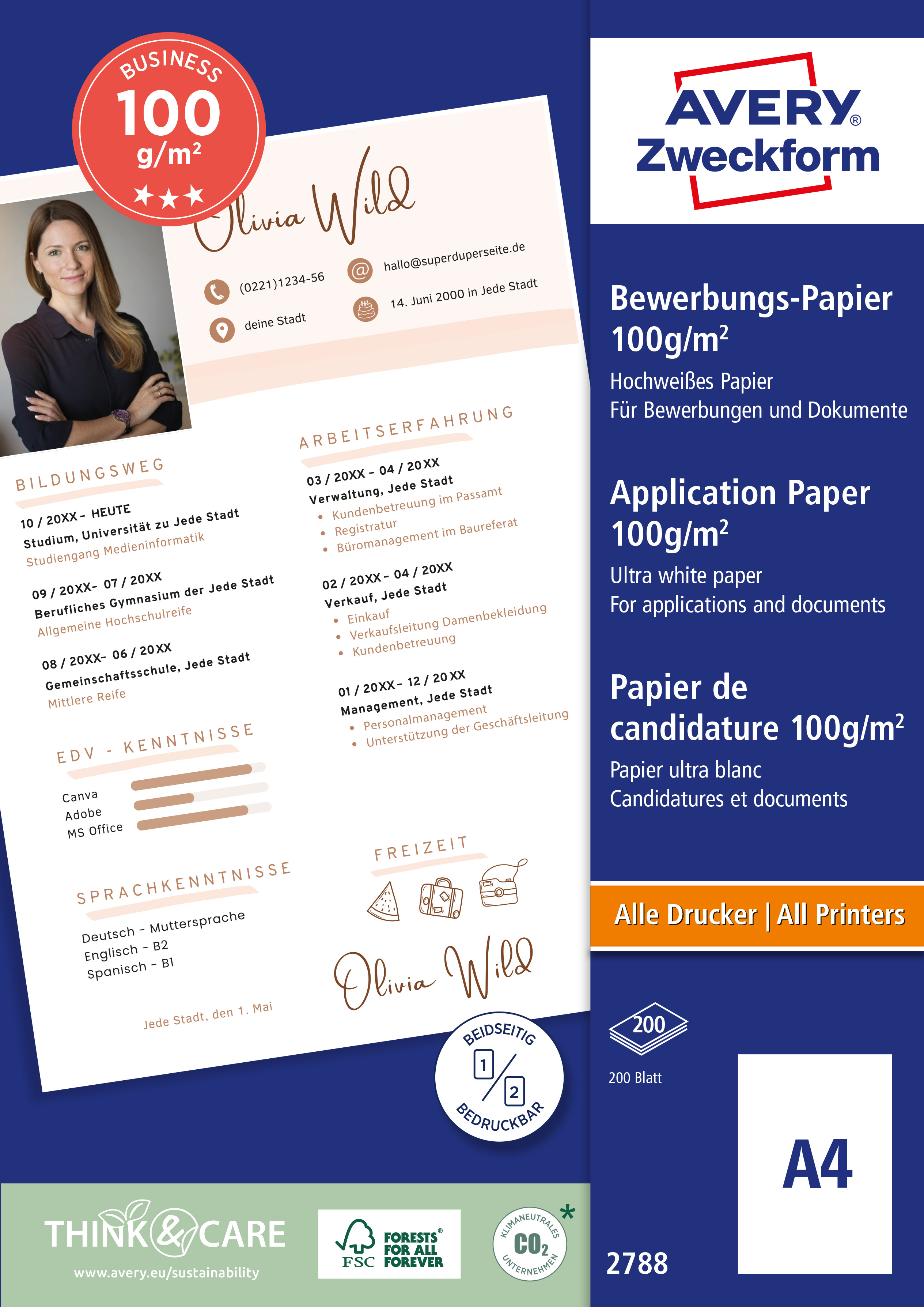 Papier aplikacyjny Business A4 do drukarki, Avery 2788 / 210 x 297 mm, 100g, 200 arkuszy, satynowany obustronnie powlekany - biały