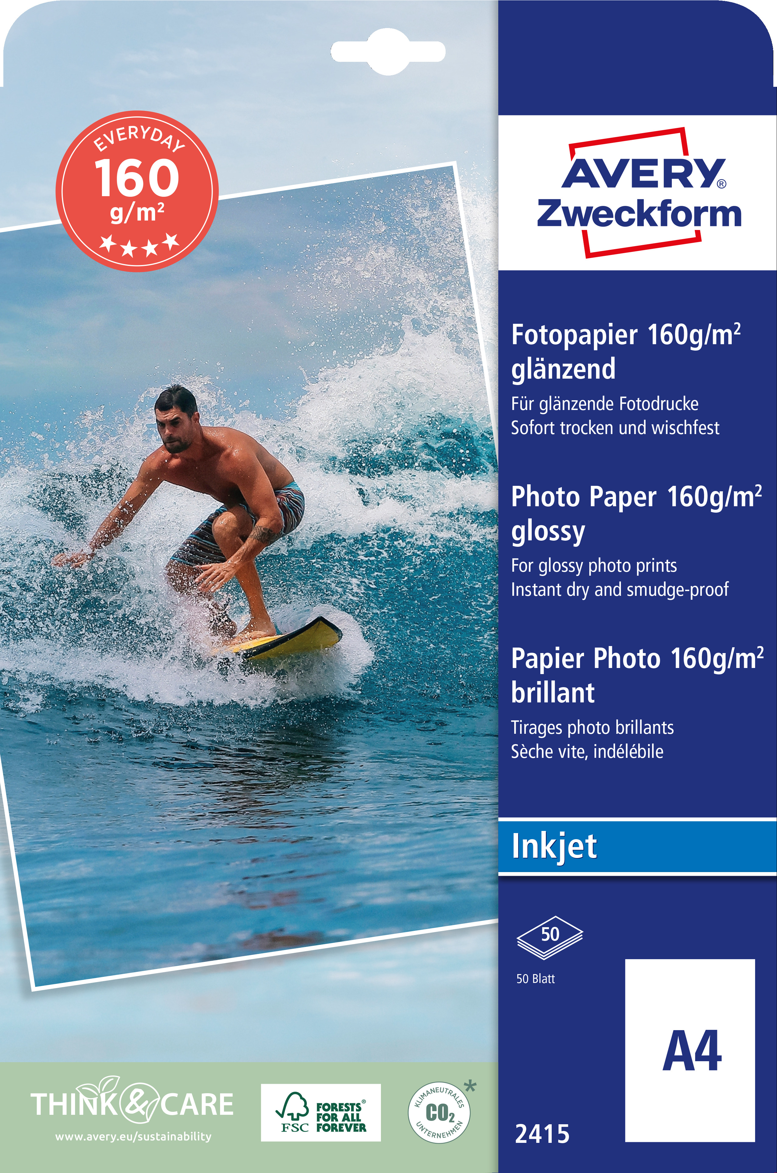 Papier fotograficzny Everyday A4 do drukarki, Avery 2415 / 210 x 297 mm, 160 g, 50 arkuszy, błyszczący - biały
