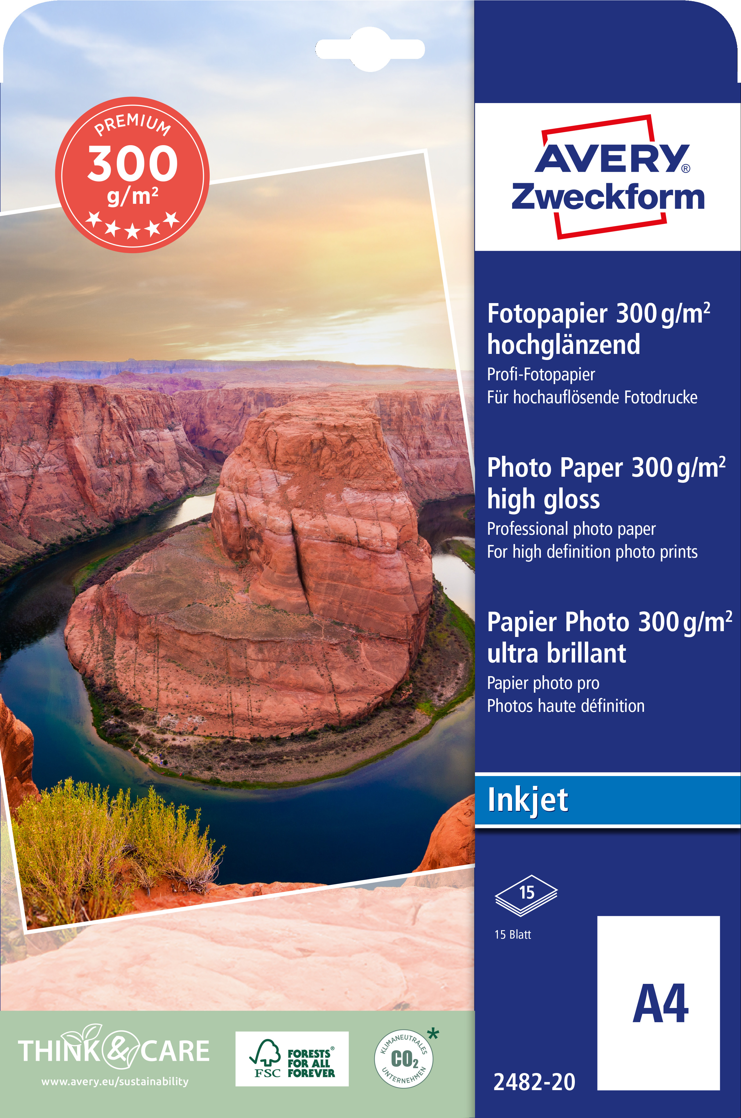 Papier fotograficzny Premium A4 do drukarki, Avery 2482-20 / 210 x 297 mm, 300 g, 15 arkuszy, wysoki połysk - biały