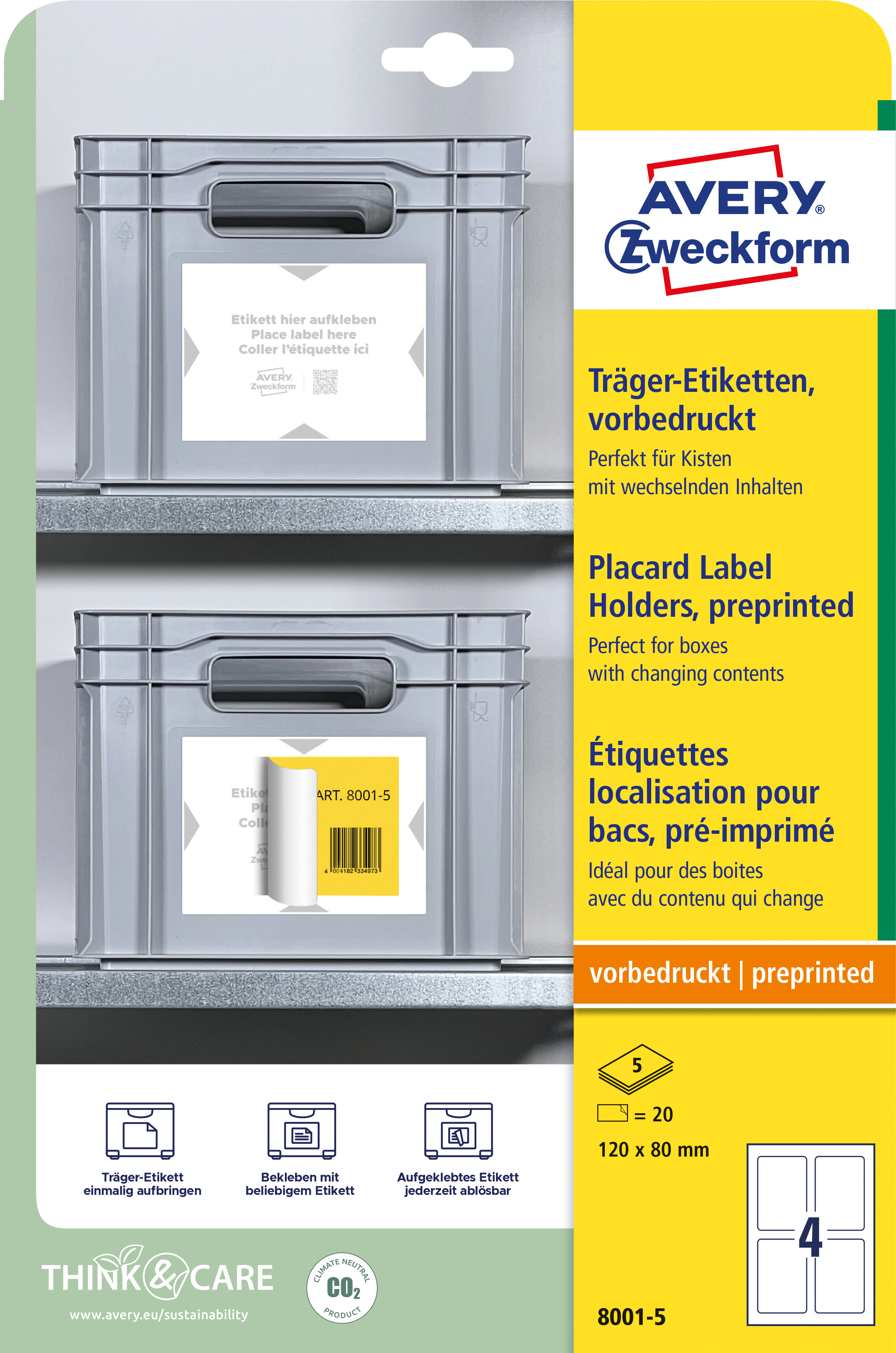 • Think & Care – Firma Avery Zweckform od 2020 roku jest neutralna dla klimatu: emisje gazów cieplarnianych w zakładzie firmy są równoważone przez certyfikowane projekty ochrony klimatu. Od 2014 roku wykorzystywana jest wyłącznie ekologiczna energia elektryczna/gaz. Badania, rozwój, produkcja, logistyka oraz administracja w siedzibie firmy w Oberlaindern w Bawarii gwarantują najwyższe standardy jakości i ochrony środowiska oraz krótkie trasy dostaw. Podkładki pod etykiety są produkowane w sposób neutralny dla klimatu, a emisja gazów cieplarnianych z materiału jest kompensowana.