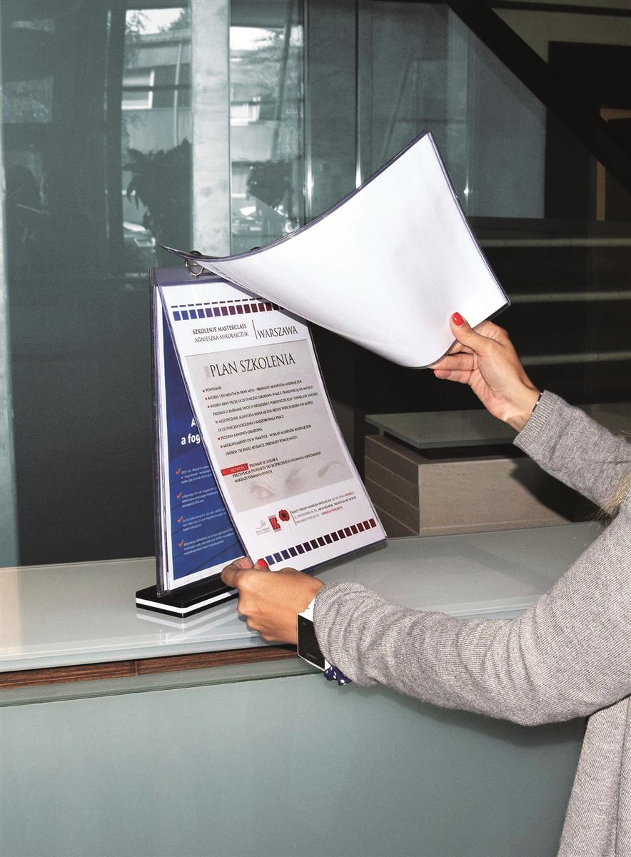 - możliwość prezentacji arkuszy w formacie A5 np.: ulotek, informacji, cenników, menu, materiałów handlowych i reklamowych