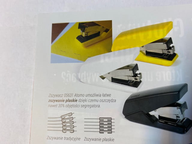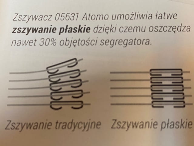 - dzięki płaskim końcówkom zszywek pozwala zaoszczędzić nawet 30% objętości segregatora