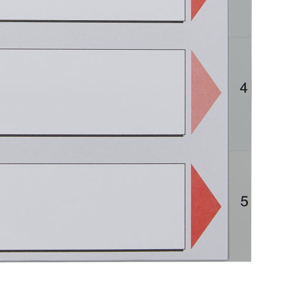 Przekładki w kolorze szarym. Wierzchnia karta z wydzielonymi, dużymi powierzchniami na opisy.