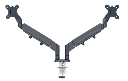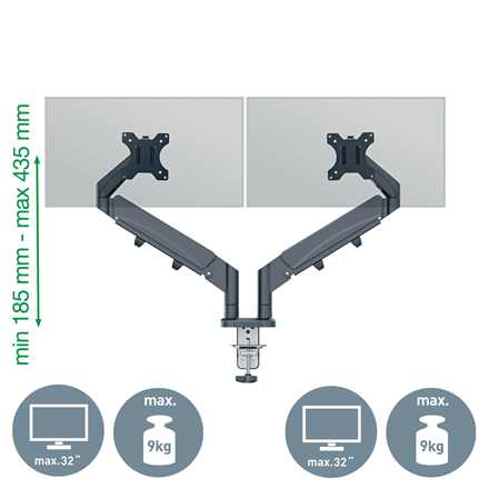 - Dwa ramiona z wbudowaną sprężyną gazową ułatwiają regulację wysokości monitorów (185 mm-435 mm)