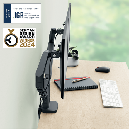Oszczędzające miejsce ramię Leitz Ergo do dwóch monitorów umożliwiają ustawienie ekranów na zgodnej z zasadami ergonomii wysokości, przyczyniając się do zachowania prawidłowej postawy, komfortowego ułożenia szyi i ramion oraz utrzymywania oczu na linii ekranu.