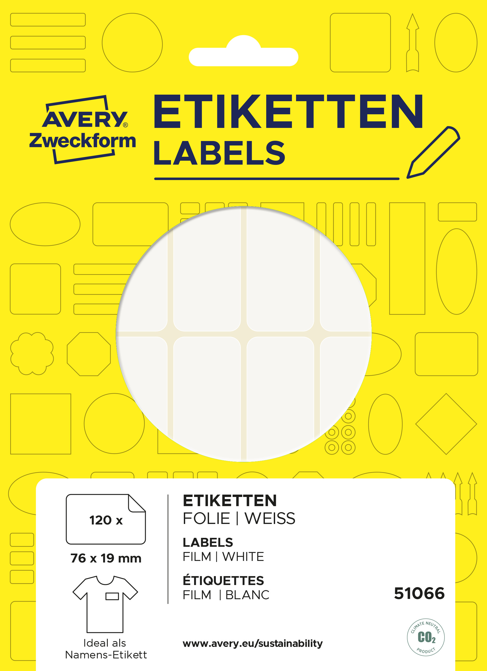 Samoprzylepne identyfikatory do opisu ręcznego , folia poliestrowa, usuwalne AVERY 51066 / 76 x 19 mm, 10 arkuszy, 120 etykiet - biały