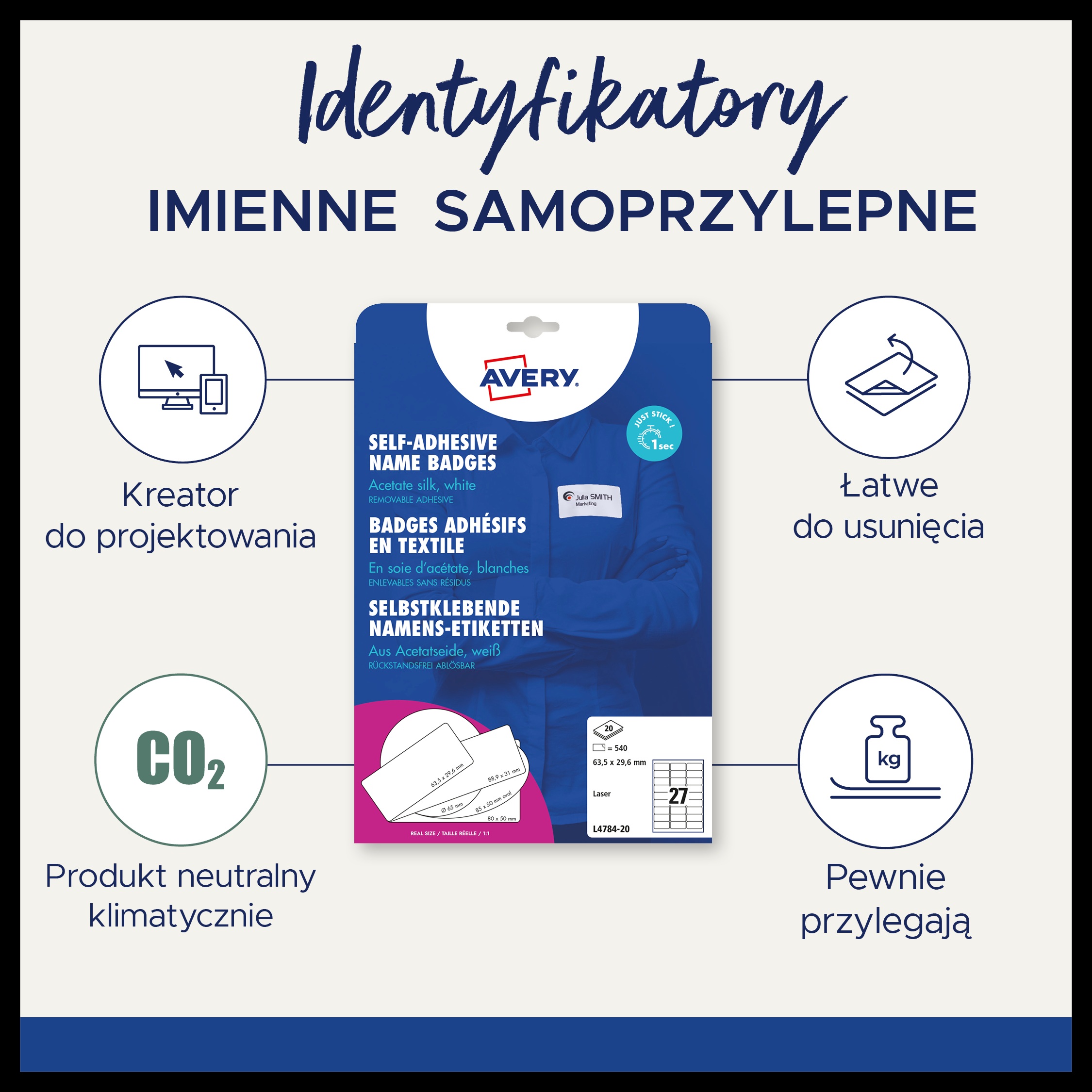 • Dzięki nacięciom na podkładzie identyfikatory można oddzielić od arkusza i używać pojedynczo.
