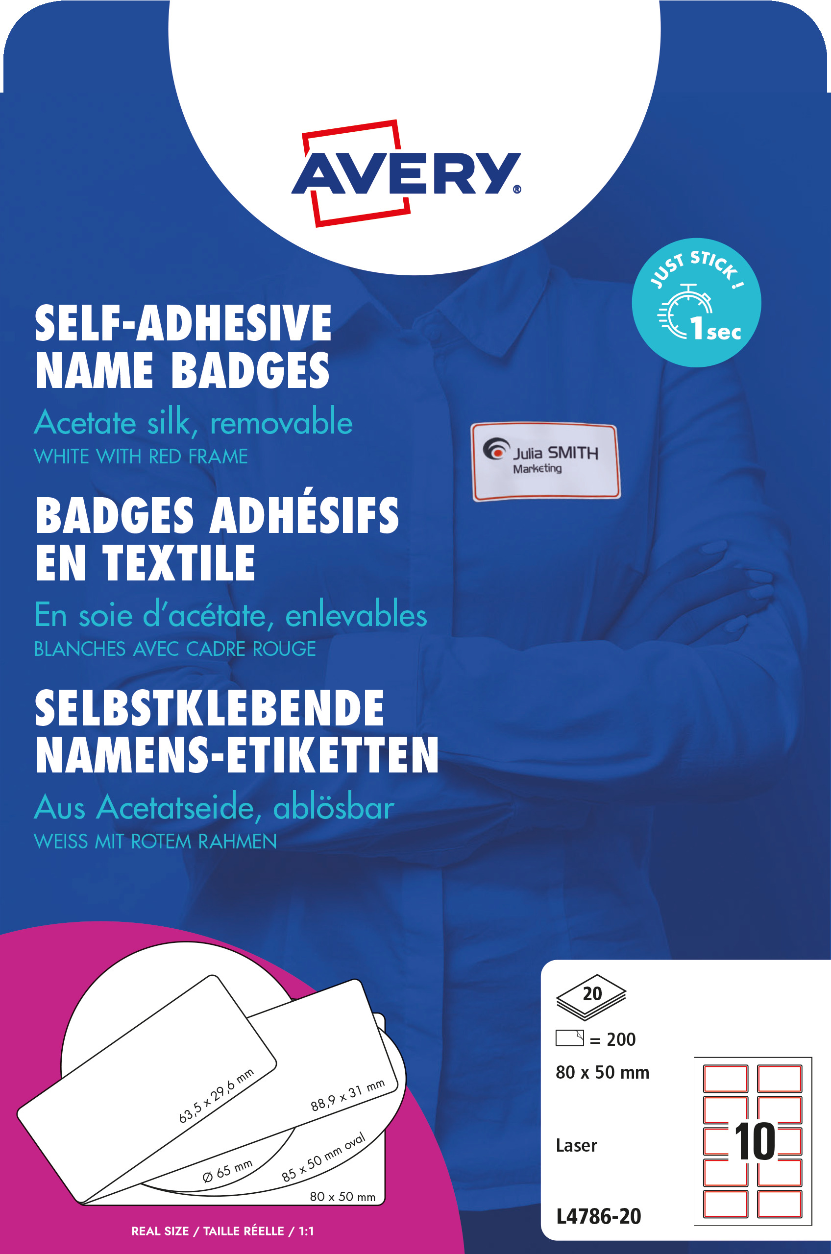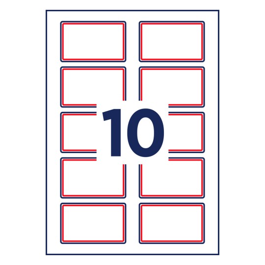 Samoprzylepne identyfikatory do zadruku, sztuczny jedwab Avery L4786-20 / 80 x 50 mm, A4, 20 arkuszy - biały z czerwoną ramką