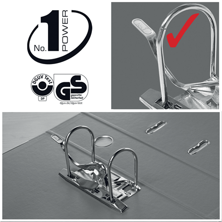- Perfekcyjnie dociskające się szczęki mechanizmu, nawet przy pełnym segregatorze