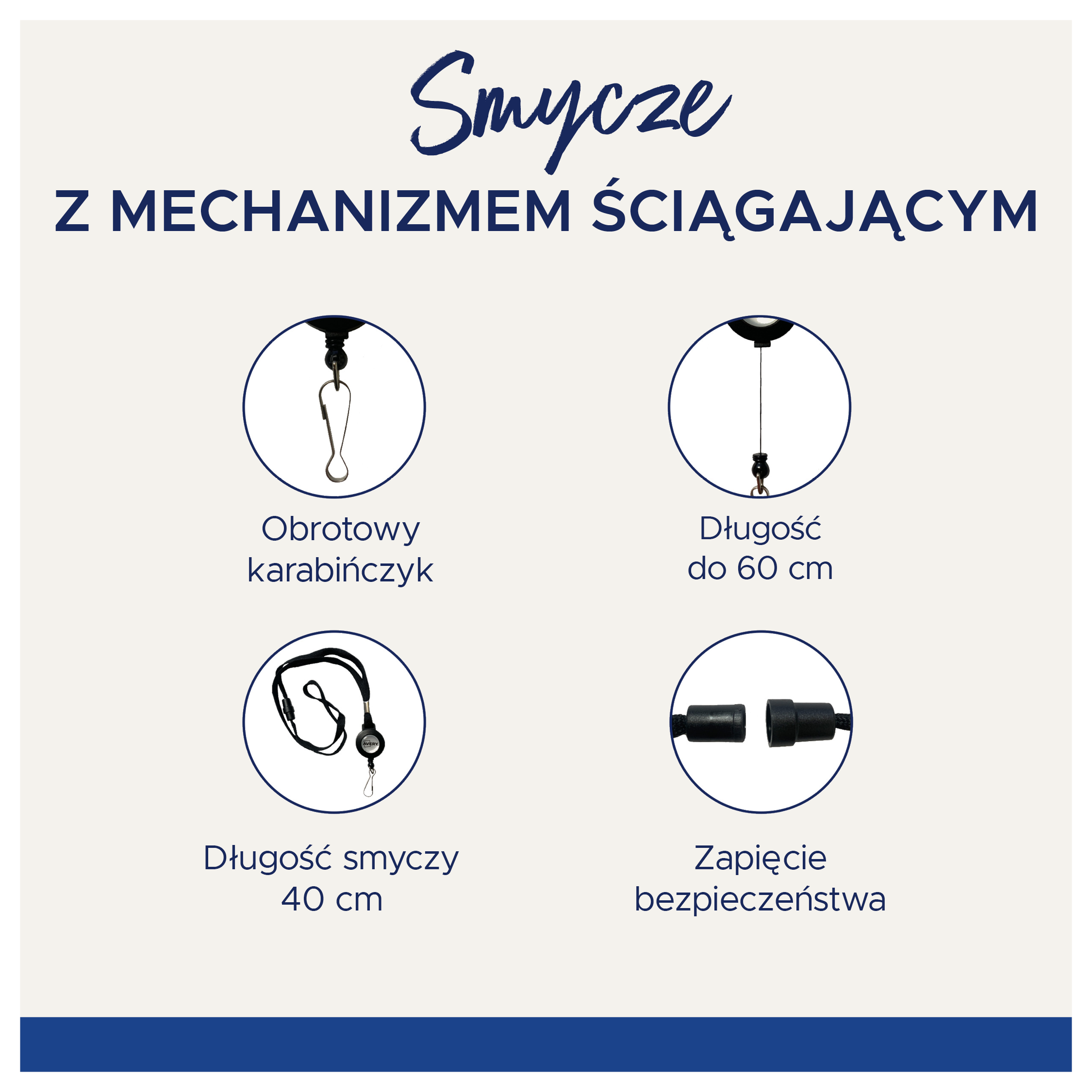 Czarne smycze z mechanizmem ściągającym, o kodzie: 4830. Wymiary: 8 mm szerokości, 400 mm długości, wraz z praktycznym mechanizmem ściągającym o długości 60 cm. Idealne na konferencje, seminaria i wszelkie imprezy firmowe lub prywatne. Mechanizm zwijający typu jo-jo ułatwia dostęp do identyfikatora i powiększa jego zasięg. Smycze posiadają zapięcie bezpieczeństwa i obrotowy karabińczyk do mocowania kart identyfikacyjnych lub uchwytów na identyfikatory. Smycze są miękkie w dotyku, dzięki czemu wygodnie się je nosi. W asortymencie Avery można znaleźć również smycze w innych kolorach i wzorach, a także identyfikatory. 10 smyczy w opakowaniu.