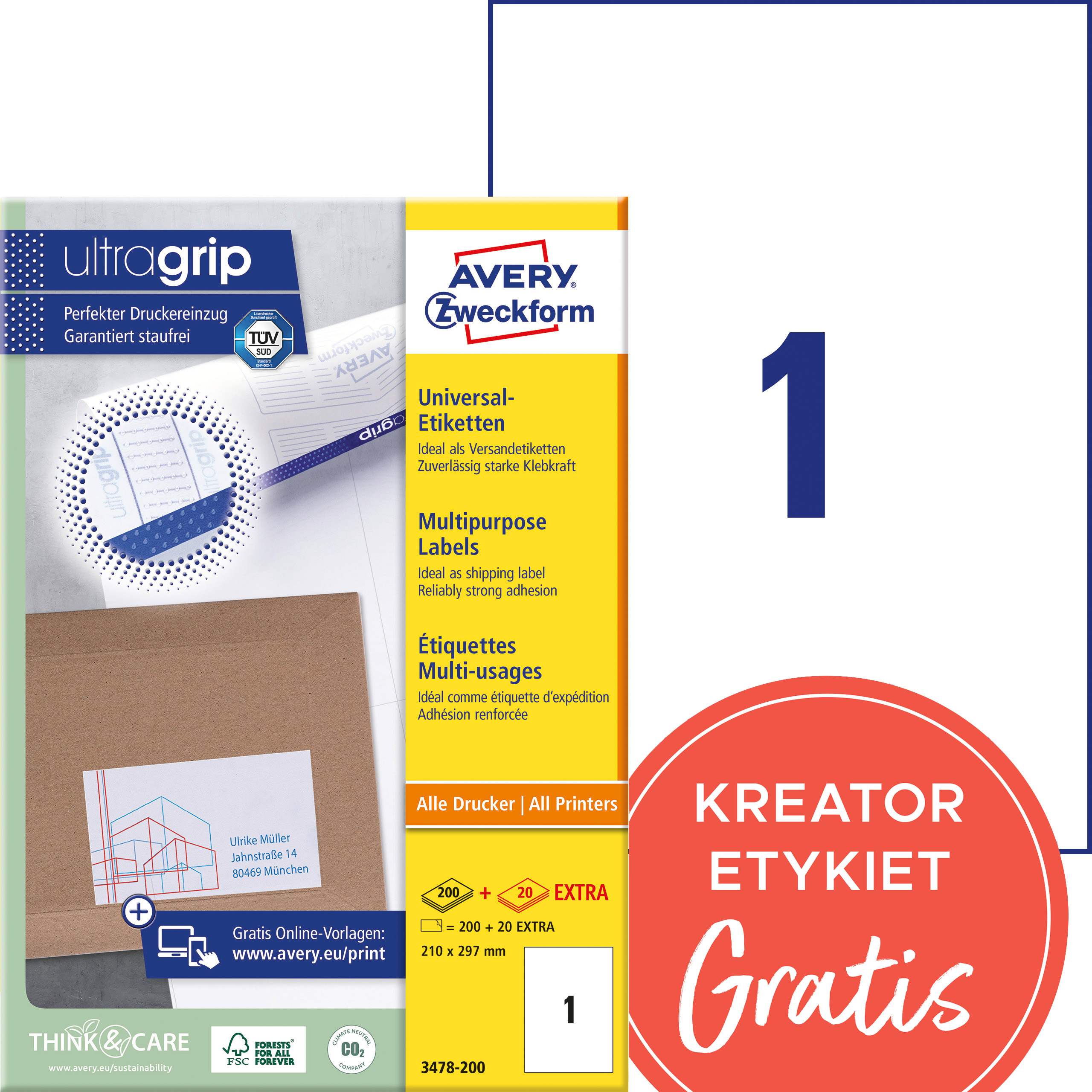 Trwałe etykiety papierowe 210 x 297 mm, białe etykiety samoprzylepne, etykiety do druku 220 ark. / op., Avery 3478-200