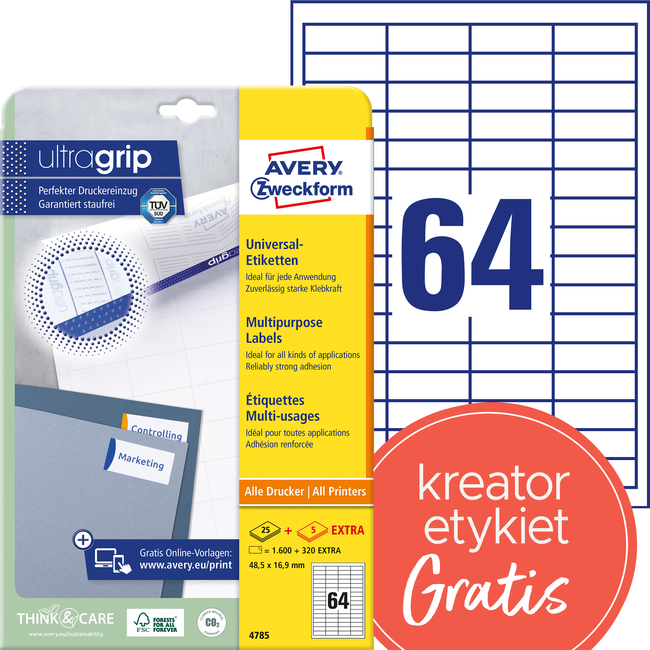 • Produkcja etykiet Avery Zweckform jest neutralna pod względem emisji CO2 (certyfikat Focus Future) i zgodna ze standardem ISO14001, który pomaga zminimalizować negatywne czynniki oddziałujące na środowisko naturalne.