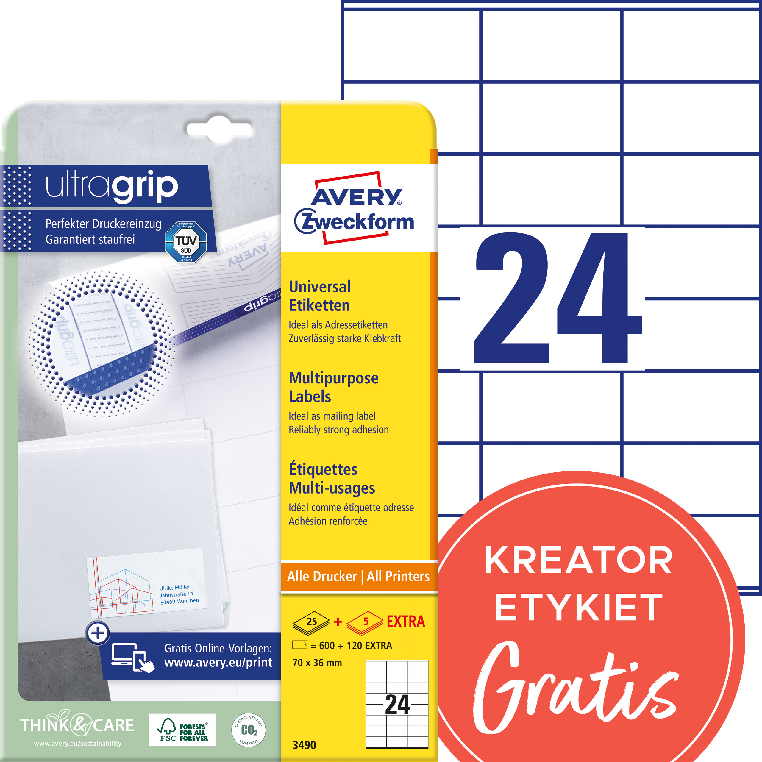 Trwałe etykiety papierowe 70 x 36 mm, białe etykiety samoprzylepne, etykiety do druku 30 ark. / op., Avery 3490