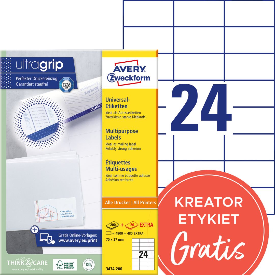 Trwałe etykiety papierowe 70 x 37 mm, białe etykiety samoprzylepne, etykiety do druku 220 ark. / op., Avery 3474-200
